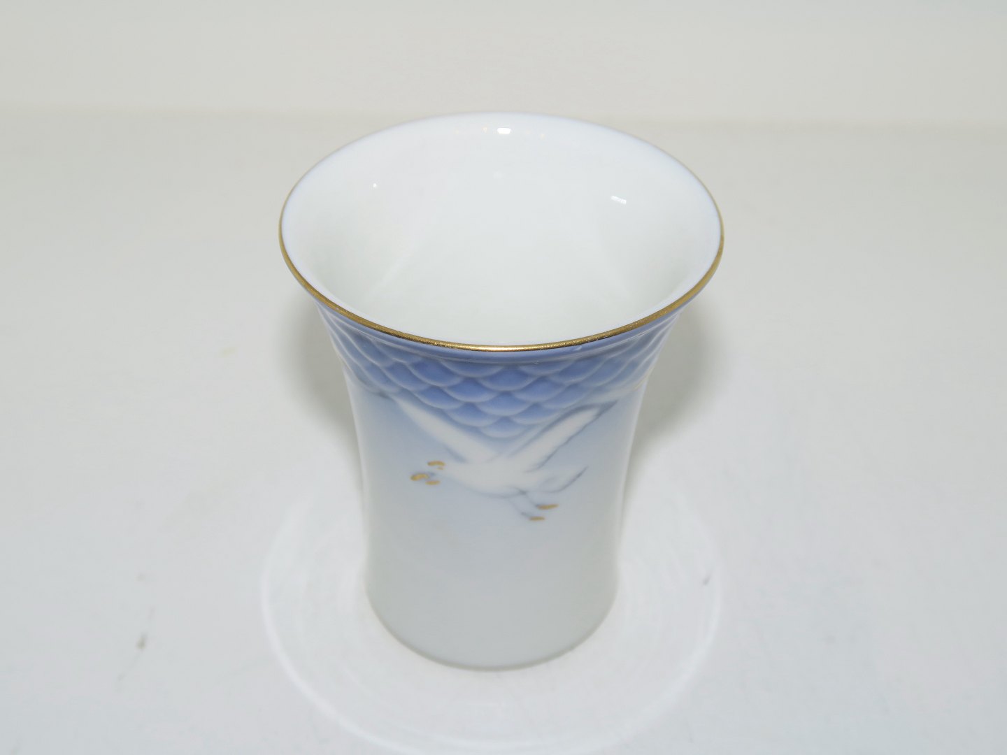 Bing & Grøndahl Måge med guldkant, lille kuvertvase. Dekorationsnummer 207 eller nyere nummer 672. 1. sortering. Højde 7,0 cm. Perfekt stand uden fejl.