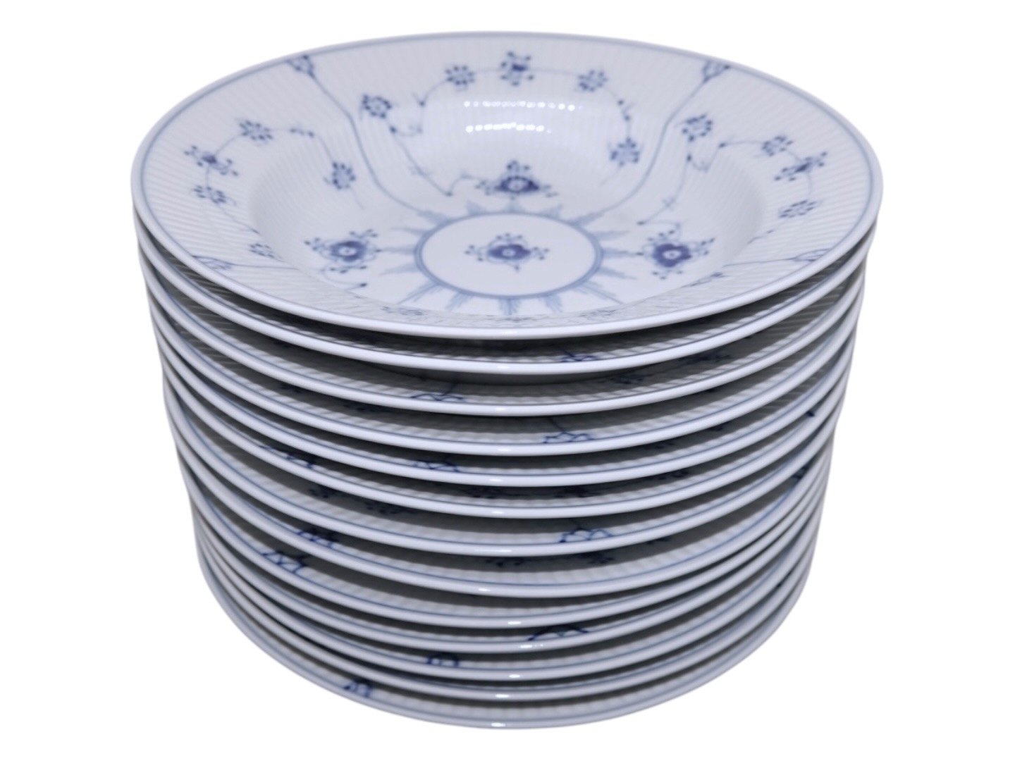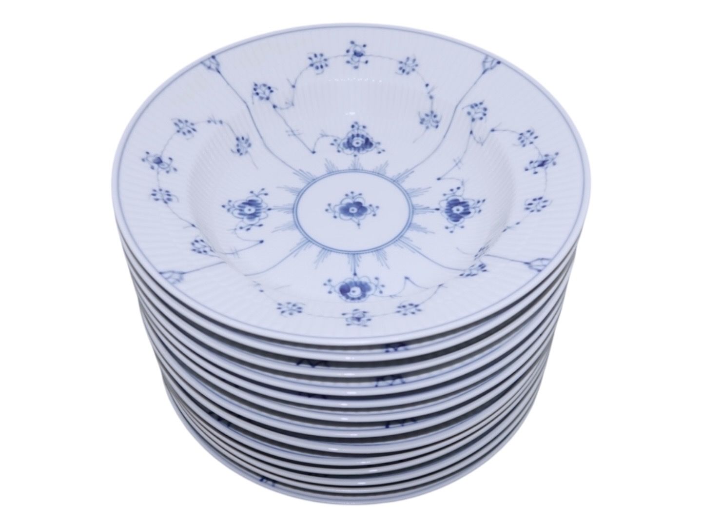 Royal Copenhagen Blue Fluted Plain, soup plate. Decoration number 605. Factory second. Diameter 23.5 cm. Perfect condition with no chips, cracks or repairs.