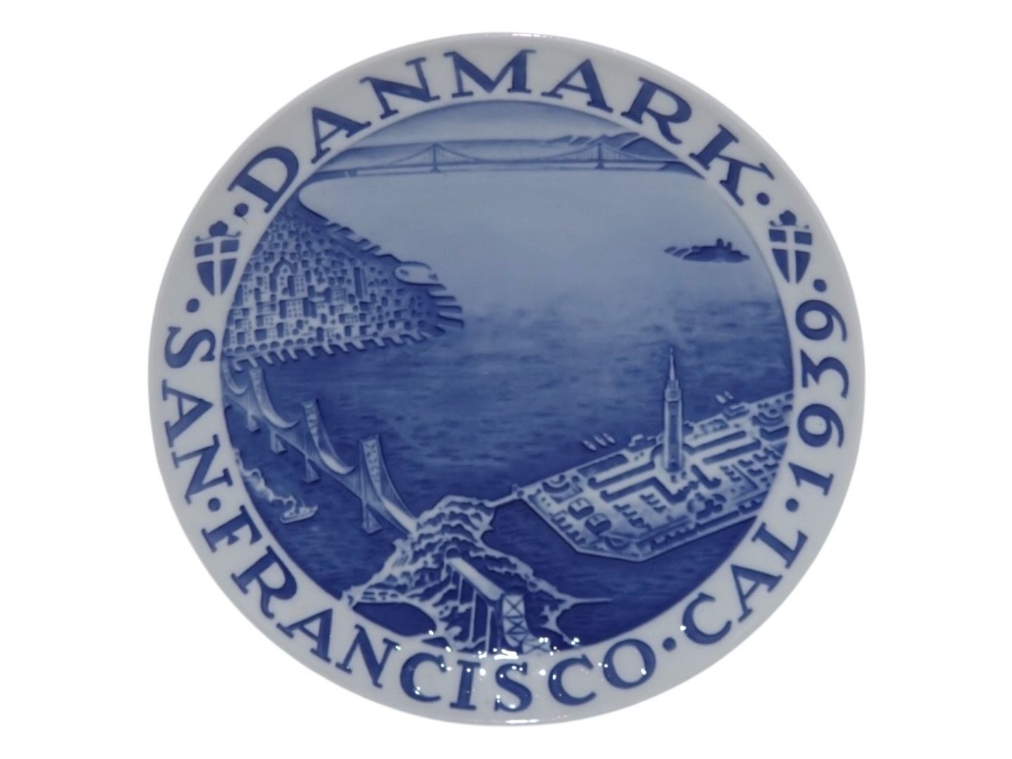 Bing & Grøndahl Mindeplatte fra 1939 med teksten: "Danmark San Fransisco Cal (Californien) 1939".