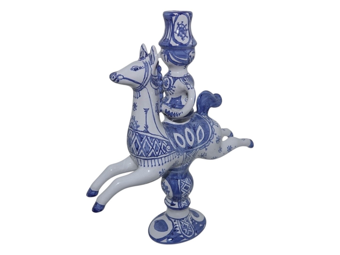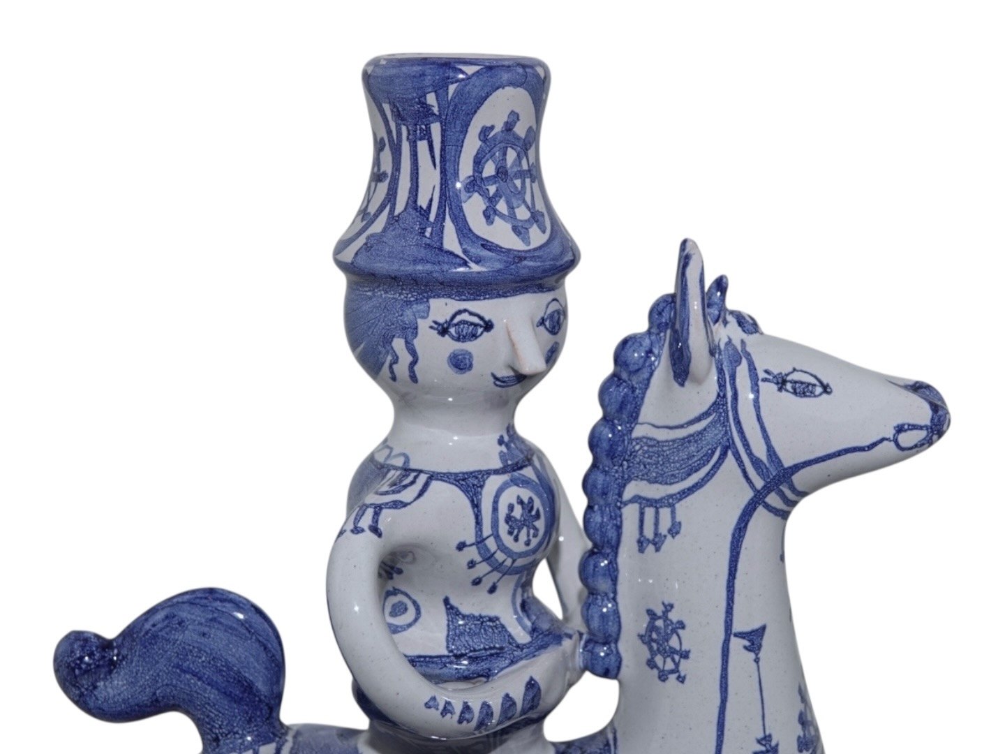 Bjørn Wiinblad figur rytter til hest - lysestage. Denne er produceret i 1979. Designnummer L4. Højde 31,8 cm., længde 27,6 cm. Perfekt stand.