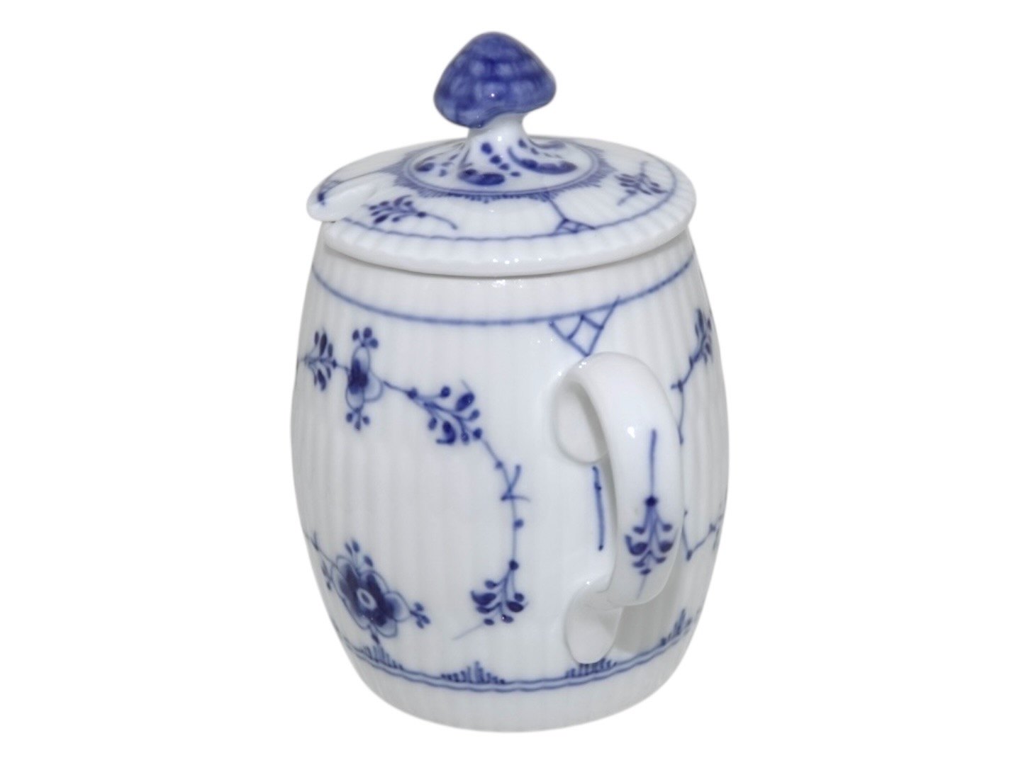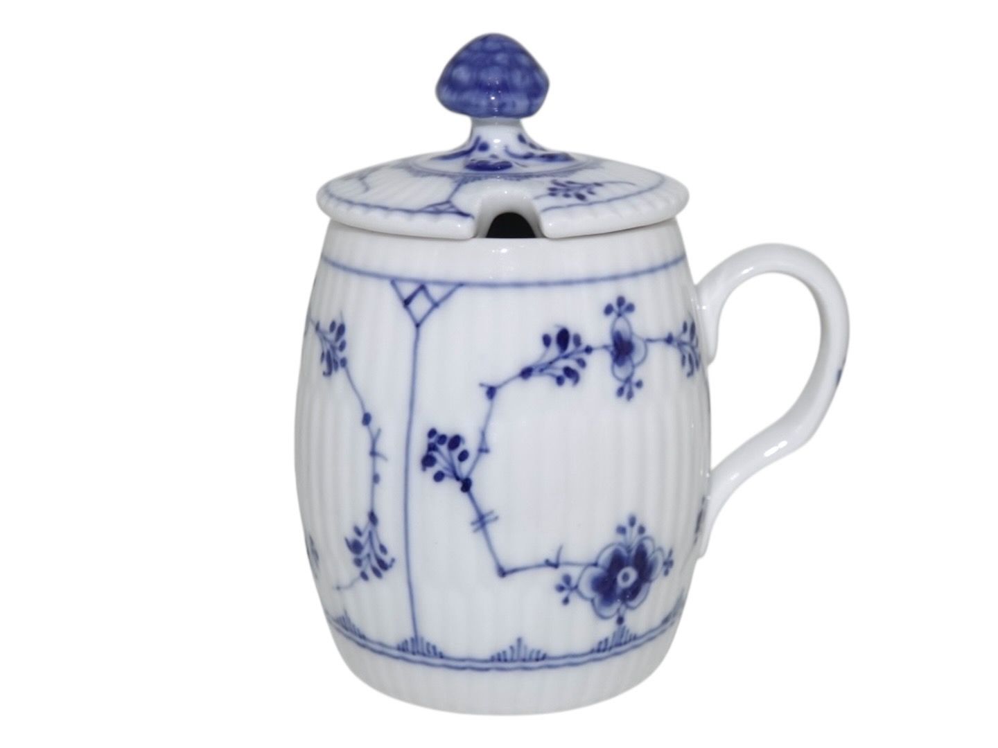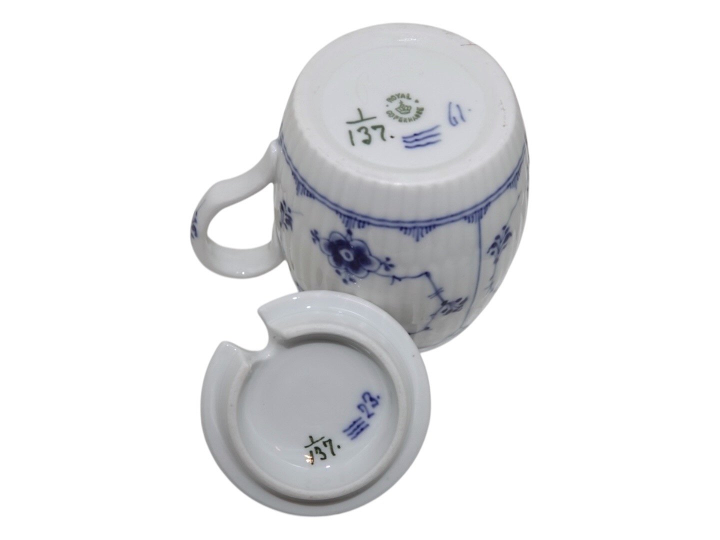 Royal Copenhagen Musselmalet Riflet, sennepskrukke med låg. Dekorationsnummer 1/137. Denne er produceret mellem 1898 og 1923. 1. sortering. Højde 9,5 cm. Perfekt stand uden fejl.