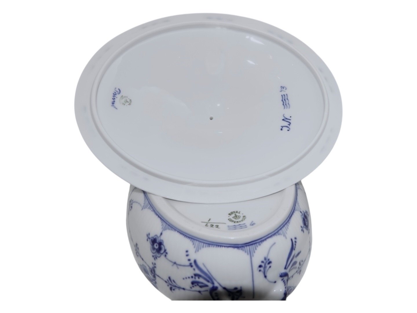 Dekorationsnummer 1/622 og låget er mærket "PRIVAT". En gang om året kunne malerinderne male en ting til dem selv. Disse blev mærket privat. De er kendetegnet ved, at man har gjort sig ekstra umage med bemalingen, da de var ting til malerinderne selv.