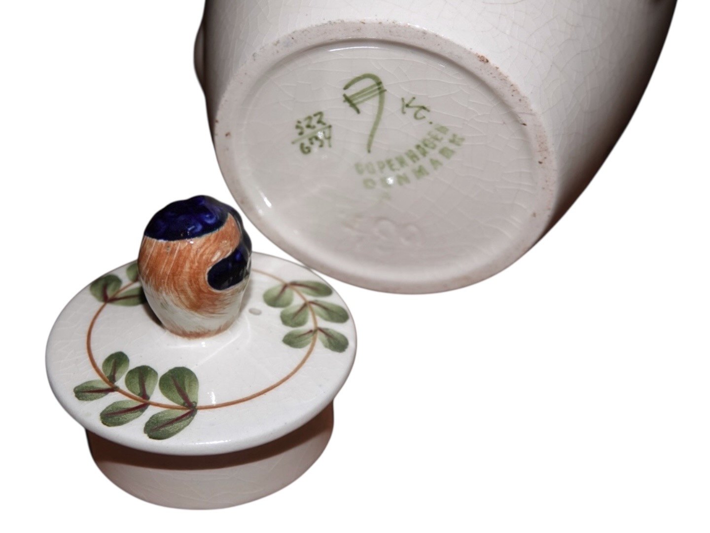 Der er en revne ved toppen se foto 3 samt krakkereringer og misfarvninger i glasuren.
