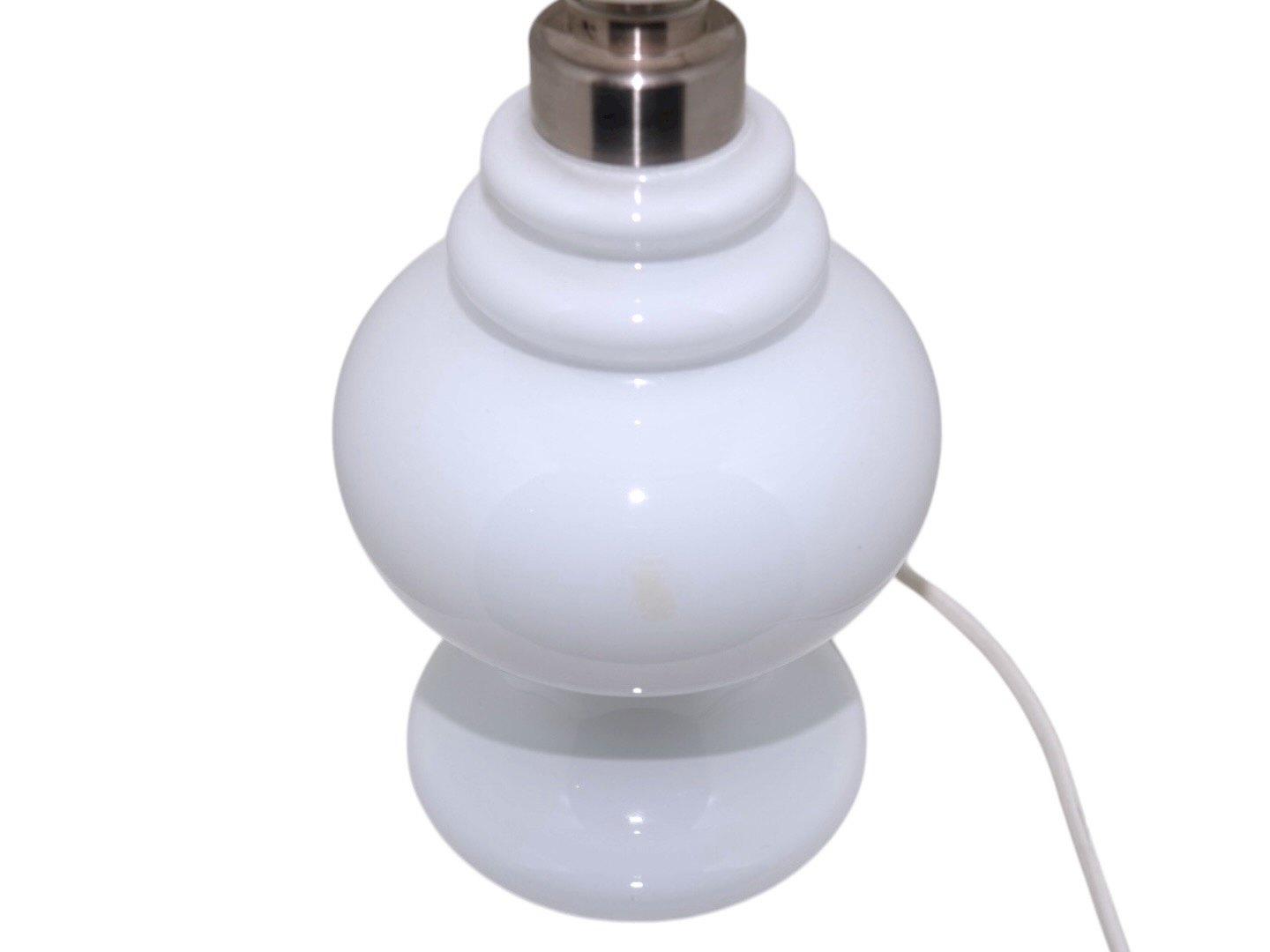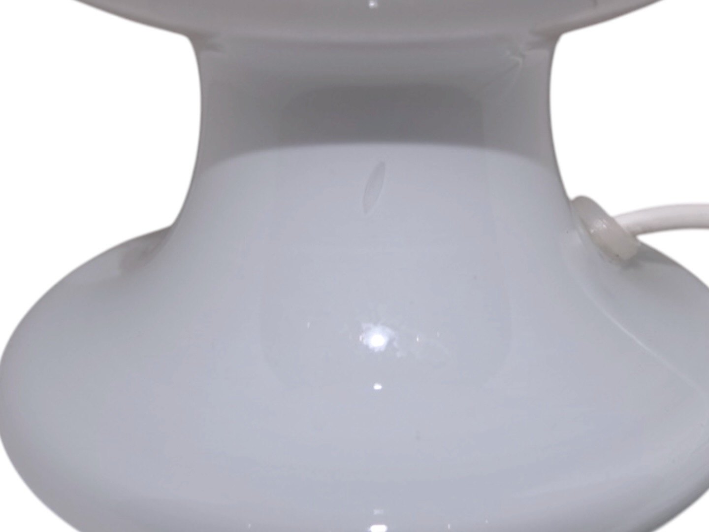 Holmegaard lille Monique bordlampe i hvidt opalglas. Designet af Michael Bang i 1982. Højde 15,5/23,5 cm. uden/med fatning. Der er en medfødt lille bobbel i glasset på foden, se sidste foro, ellers perfekt stand.