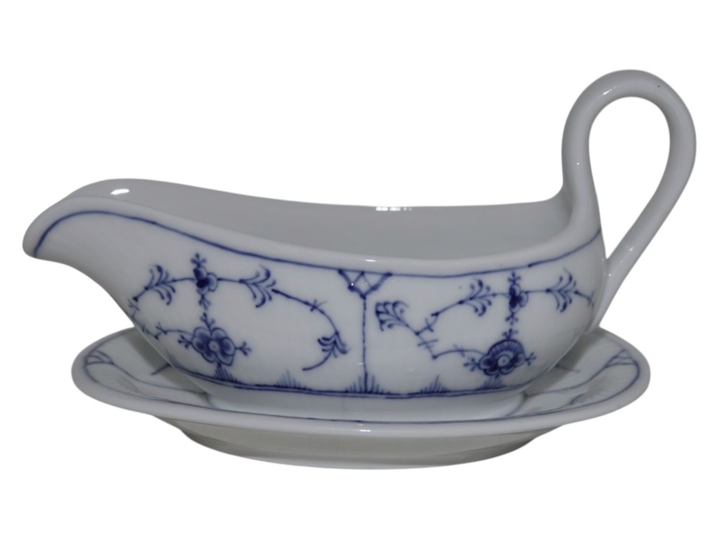 Royal Copenhagen Musselmalet Riflet, lille sovseskål på fast underfad.