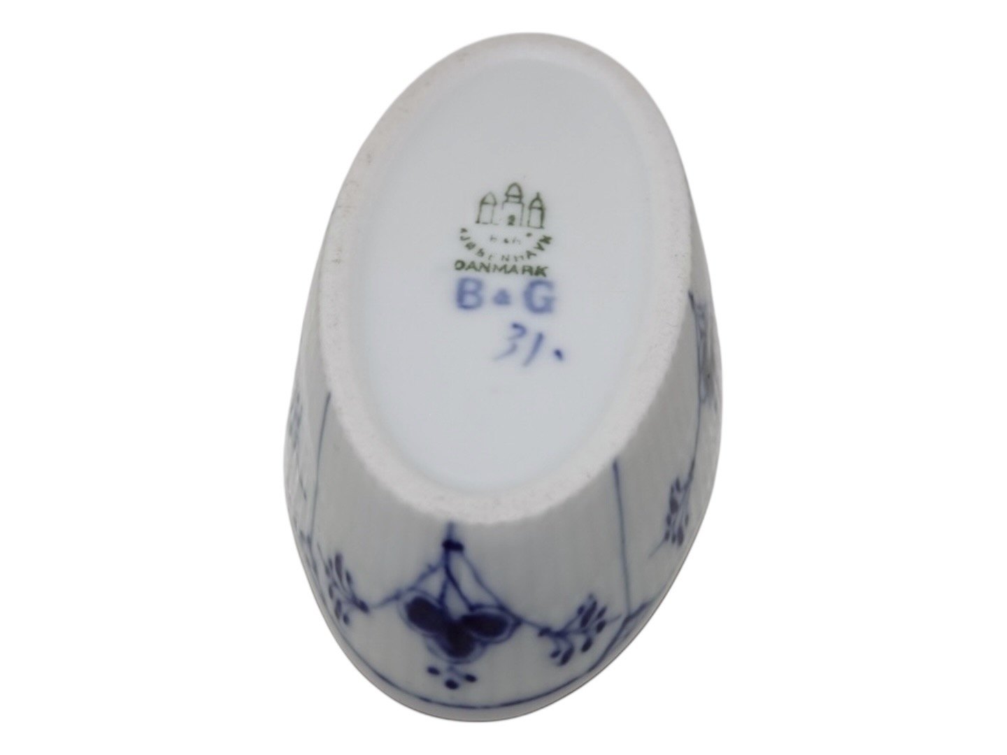 Bing & Grøndahl Blåmalet (Musselmalet), stort saltkar. Af fabriksmærket ses det, at disse er fra mellem 1915 og 1948. 1. sortering. Længde 9,2 cm. Perfekt stand uden fejl.