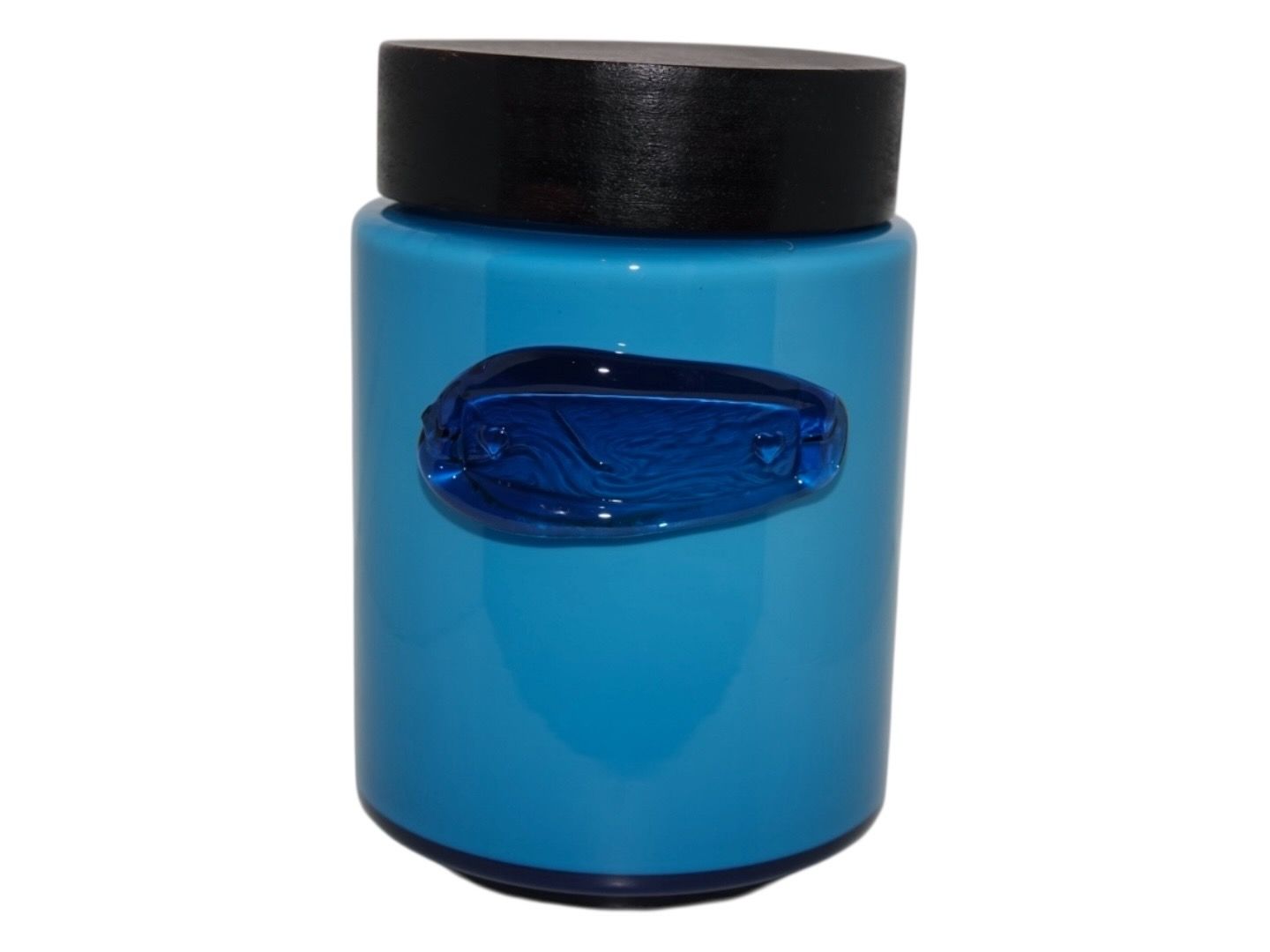 Holmegaard Palet, blå opbevaringskrukke med trælåg uden tekst.