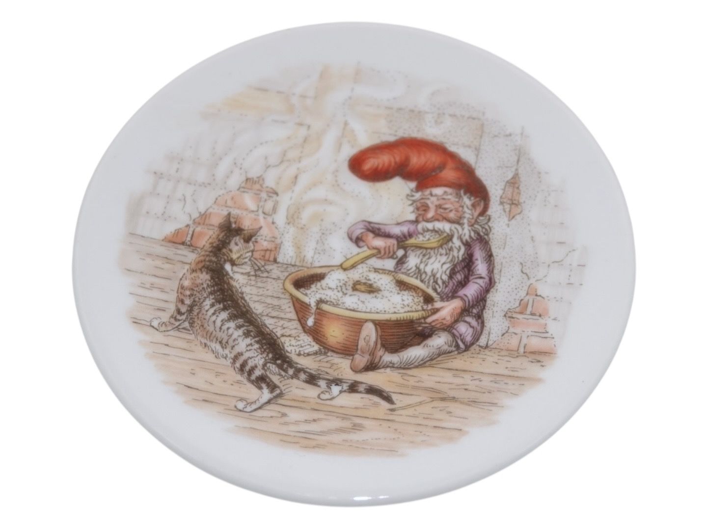 Royal Copenhagen julestel, lille asiet med julenisse, risengrød og kat. 1. sortering. Diameter 10,2 cm. Perfekt stand uden fejl. Internt nummer: TALL4