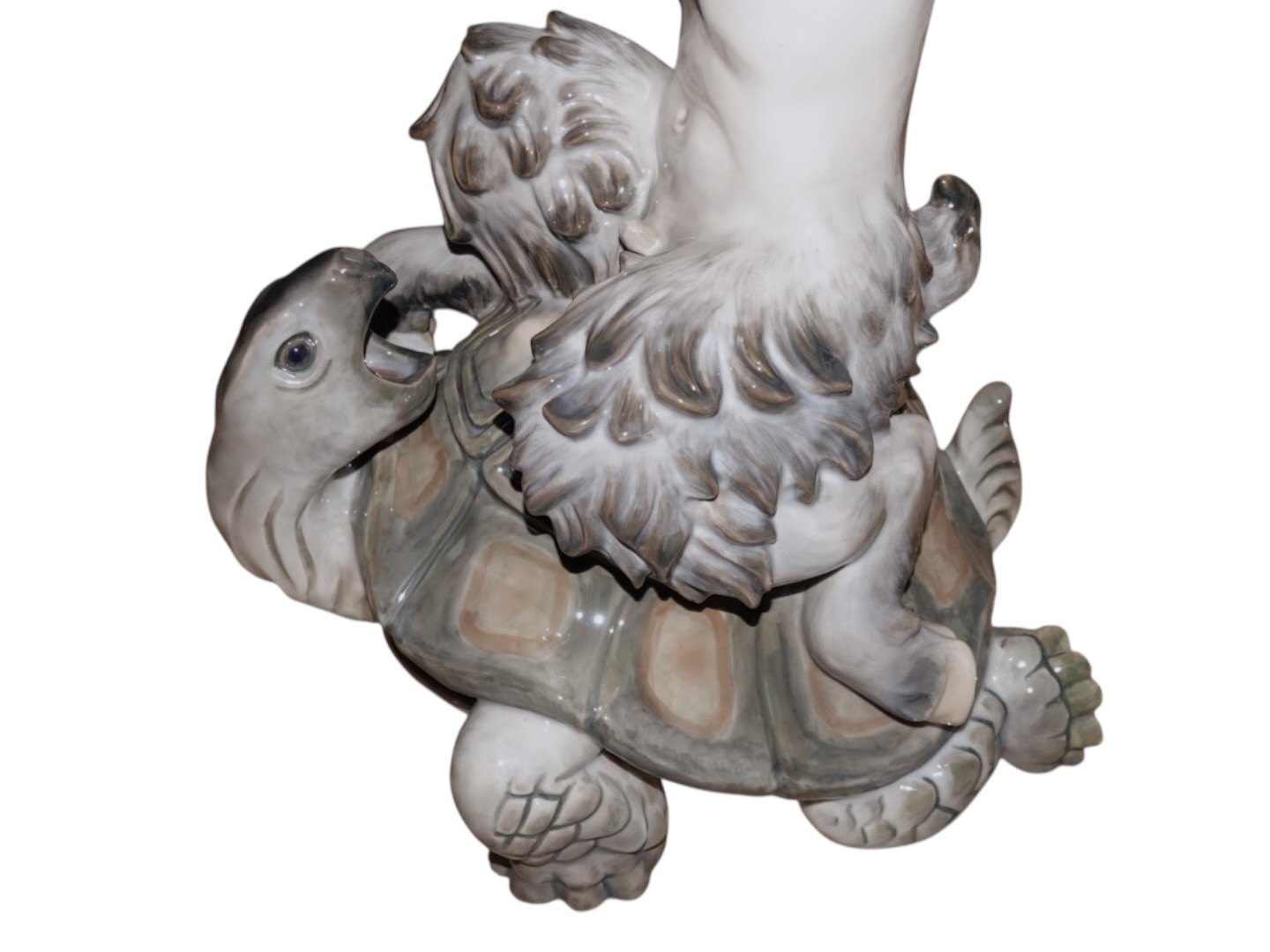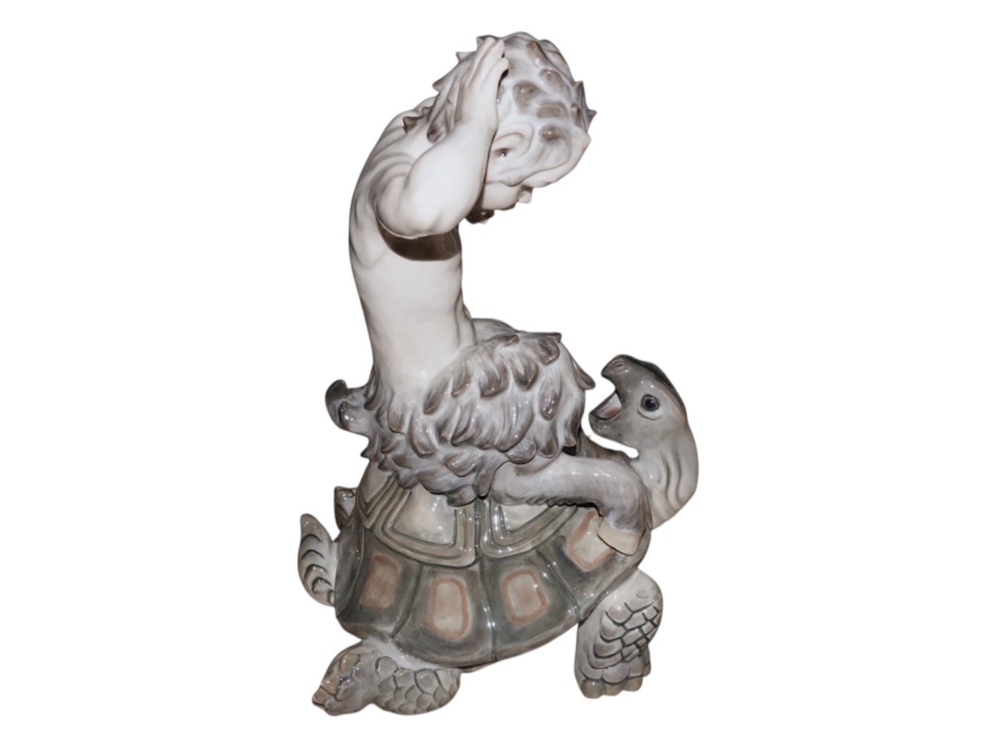 Meget sjælden kæmpe Royal Copenhagen figur, pan (faun) der kæmper med en skildpadde. På det første billede er der en "almindelig" pan figur for at illustrere størrelsesforskellen.