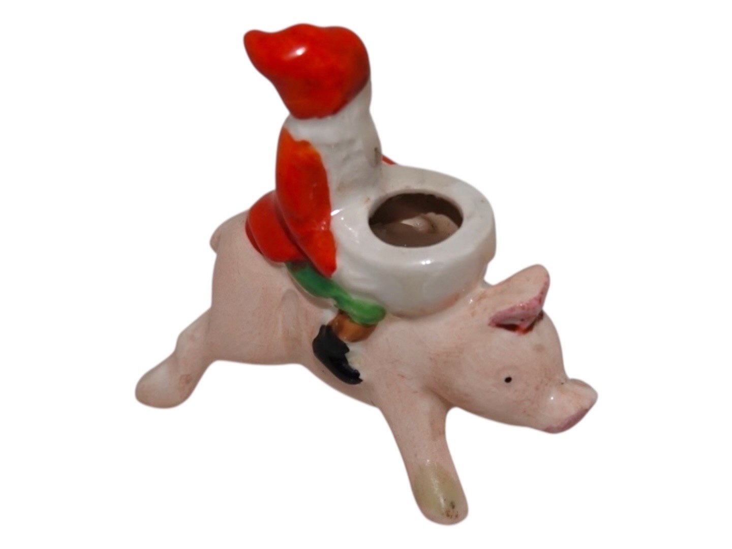 Julemand på gris figur / lysestage til et lille stearinlys. Den er fra ca. 1950. Længde 6,5 cm., højde 6,8 cm. Fin og velholdt stand.