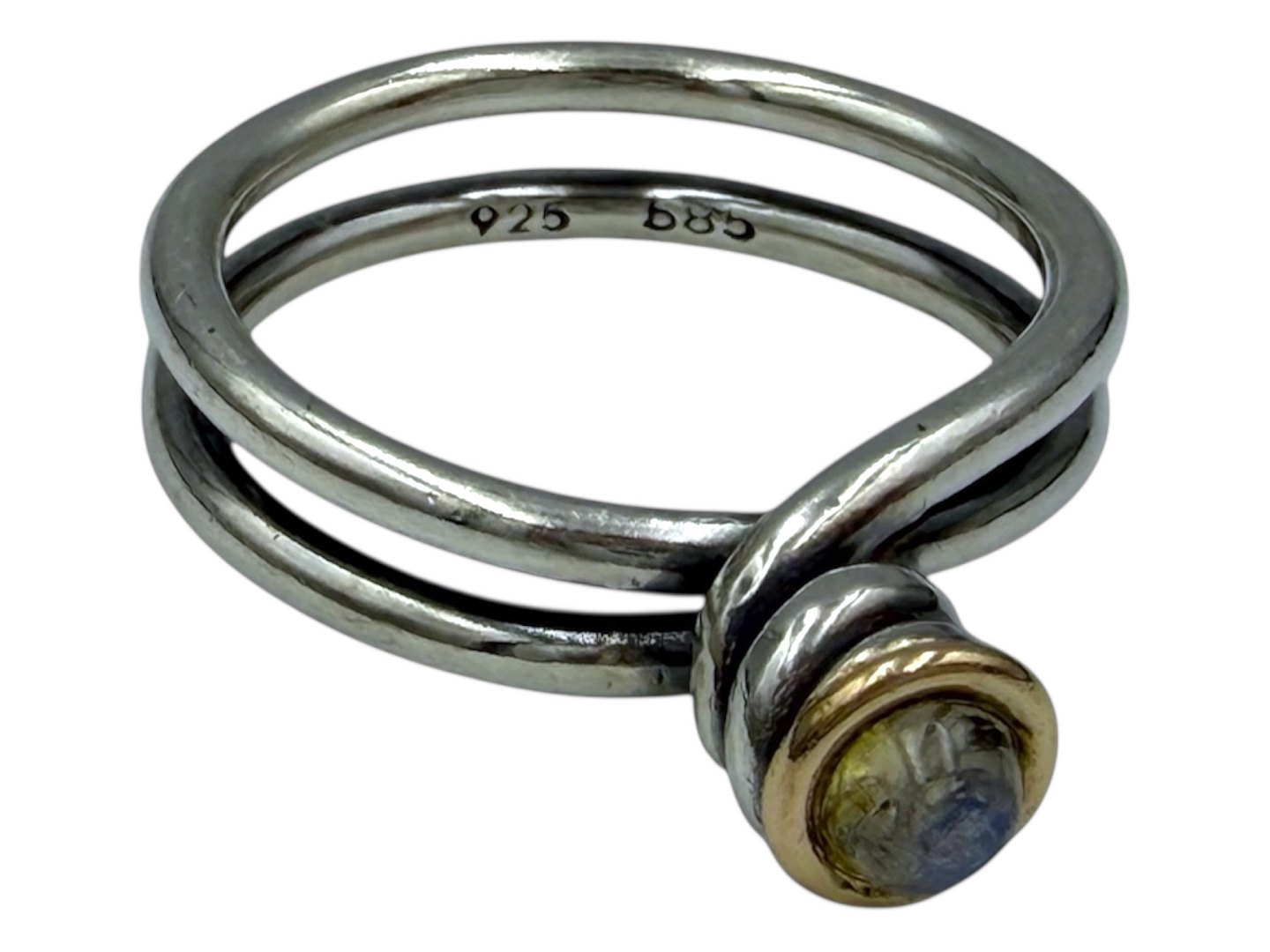 Sterlingsølv og 14 karat guld, moderne ring med sten. Stemplet "925 585". Ringstørrelse 58. Fin og velholdt stand.
