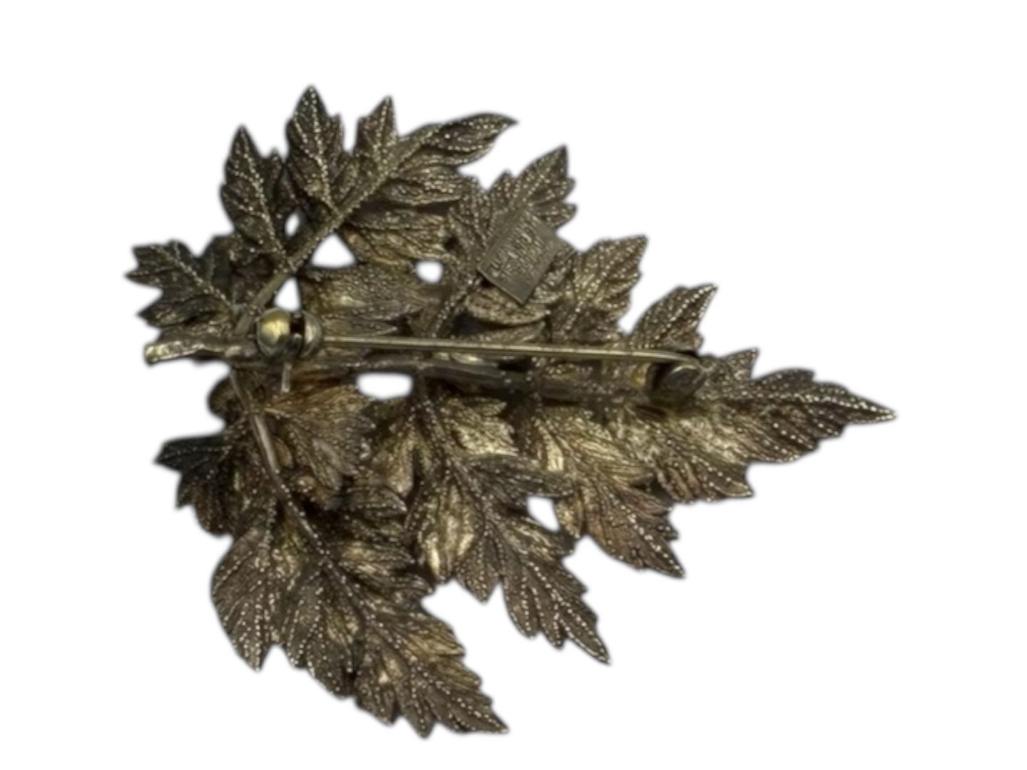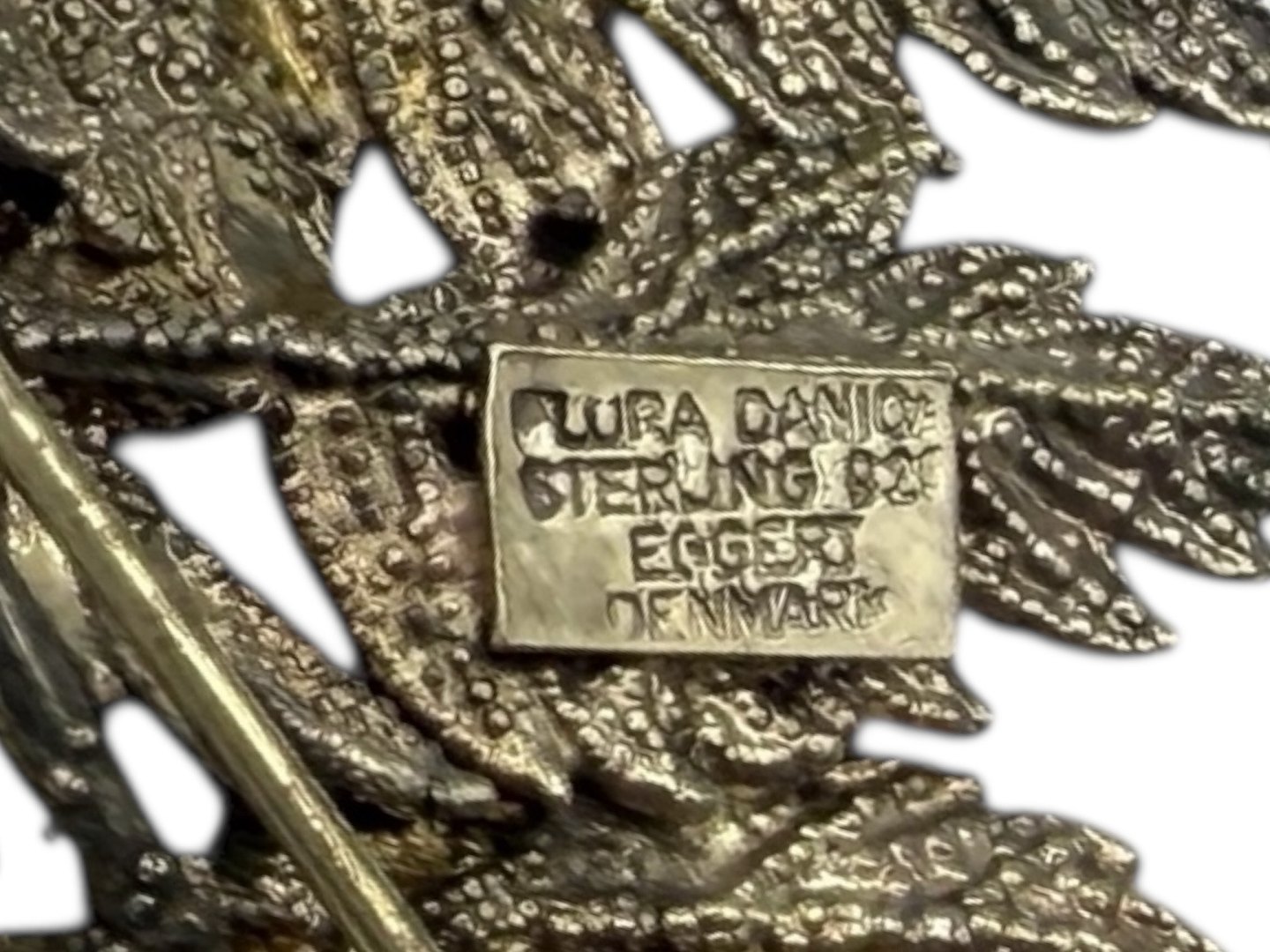 Flora Danica broche i let forgyldt sterlingsølv i kraftig kvalitet. Designet af Orla Eggert. Stemplet "EGGERT SILVER DENMARK". Måler 5,5 x 5,0 cm. Fin stand.