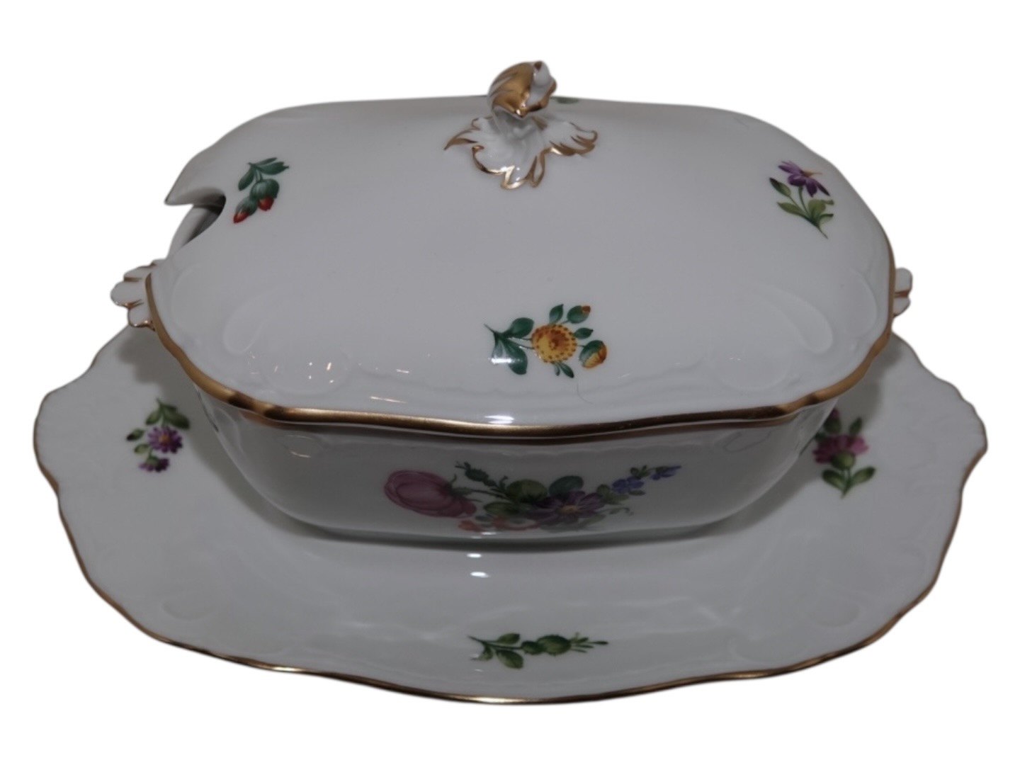 Royal Copenhagen Let Saksisk Blomst, sjælden firkantet sovseskål med låg. Af fabriksmærket kan det udledes, at denne er produceret i mellem 1898 og 1923. 2. sortering. Længde 24,2 cm. Perfekt stand uden fejl.