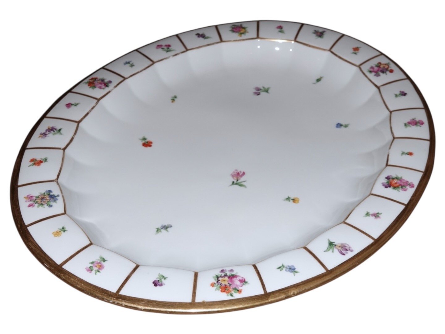 Royal Copenhagen Henriette, stort stegefad. Dekorationsnummer 444/8540. 1. sortering. Længde 41,0 cm. Der er en lille bitte smule slid på noget af guldkanten ellers perfekt stand uden fejl.