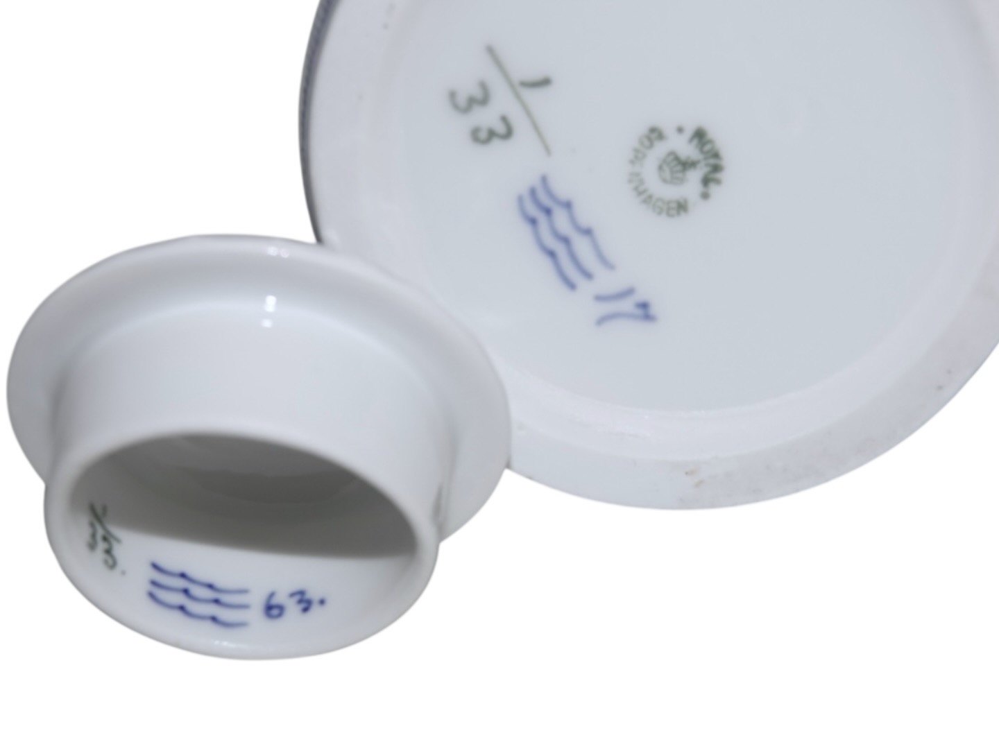 Royal Copenhagen Musselmalet Riflet, sjælden chokoladekande med tilhørende låg.