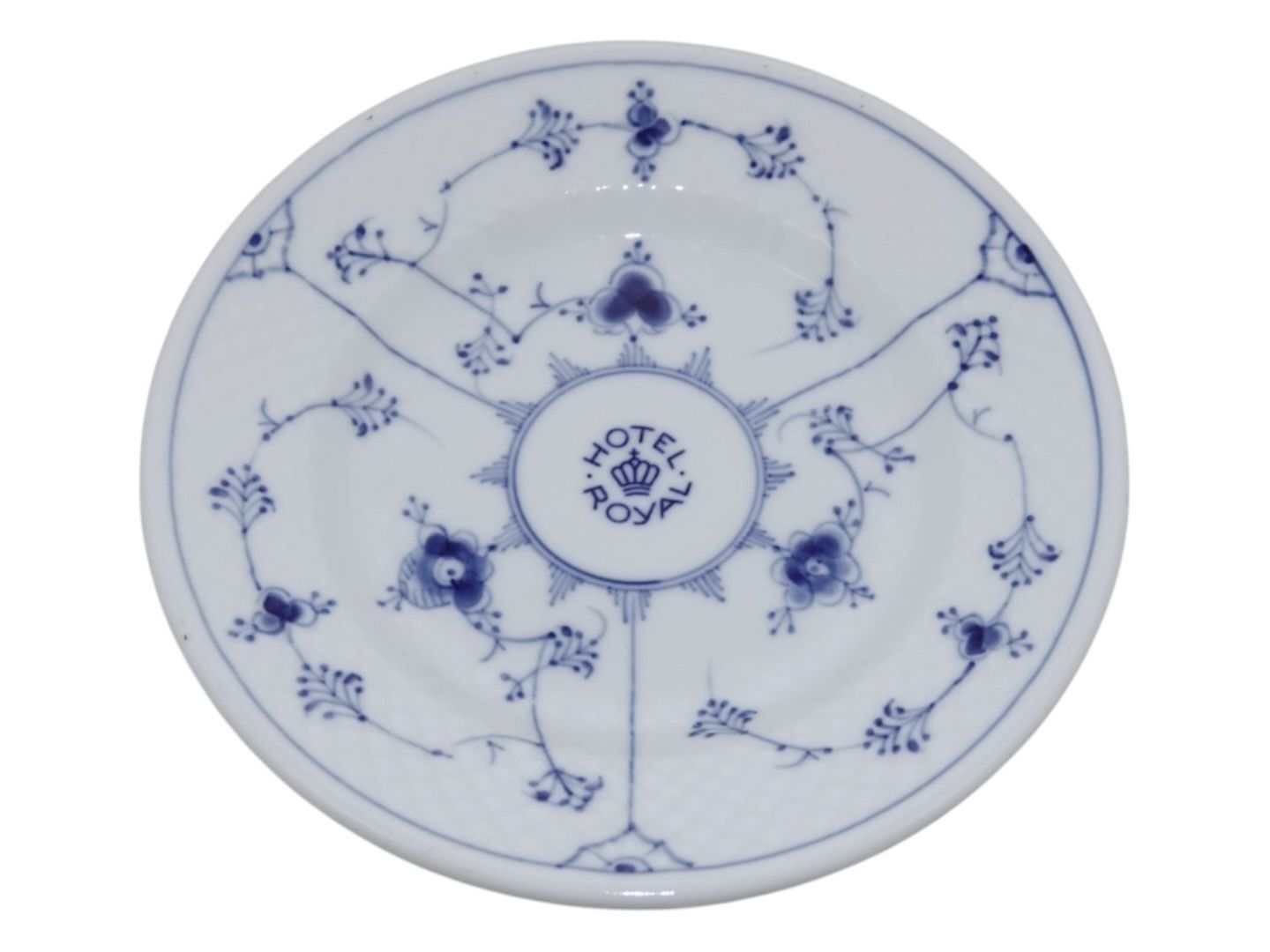 Bing & Grøndahl Blåmalet / Musselmalet tykt jernporcelæn, kagetallerken med logo fra Hotel Royal.