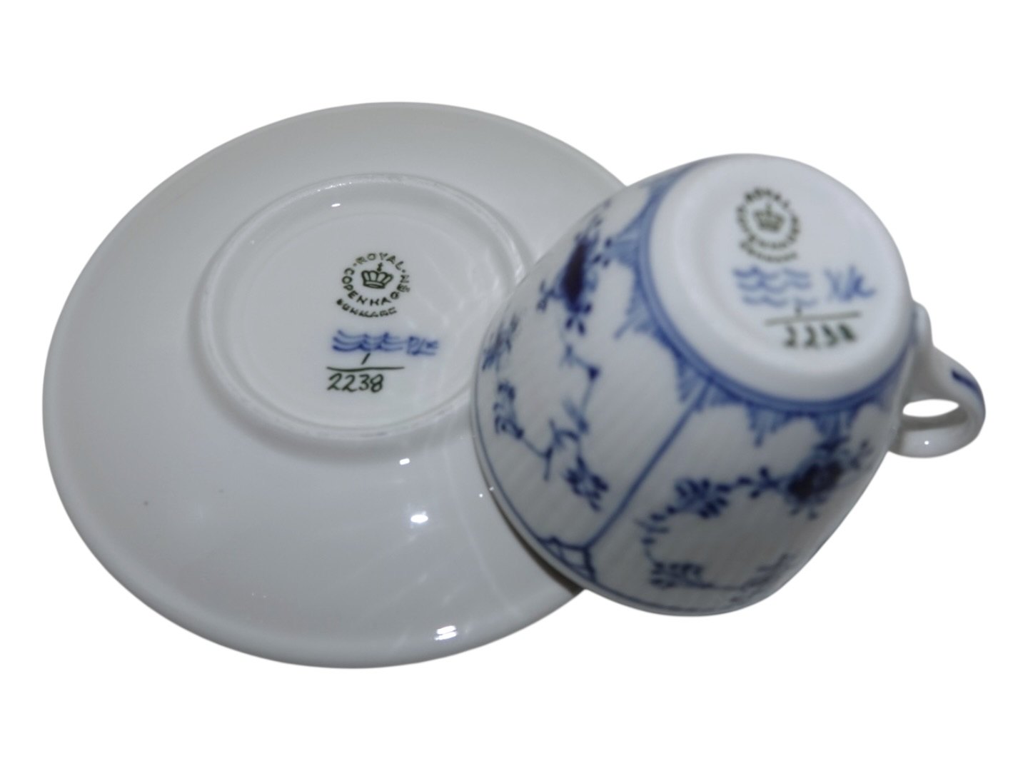 Royal Copenhagen Musselmalet Riflet Jernporcelæn (hotelporcelæn), kaffekop med tilhørende underkop.