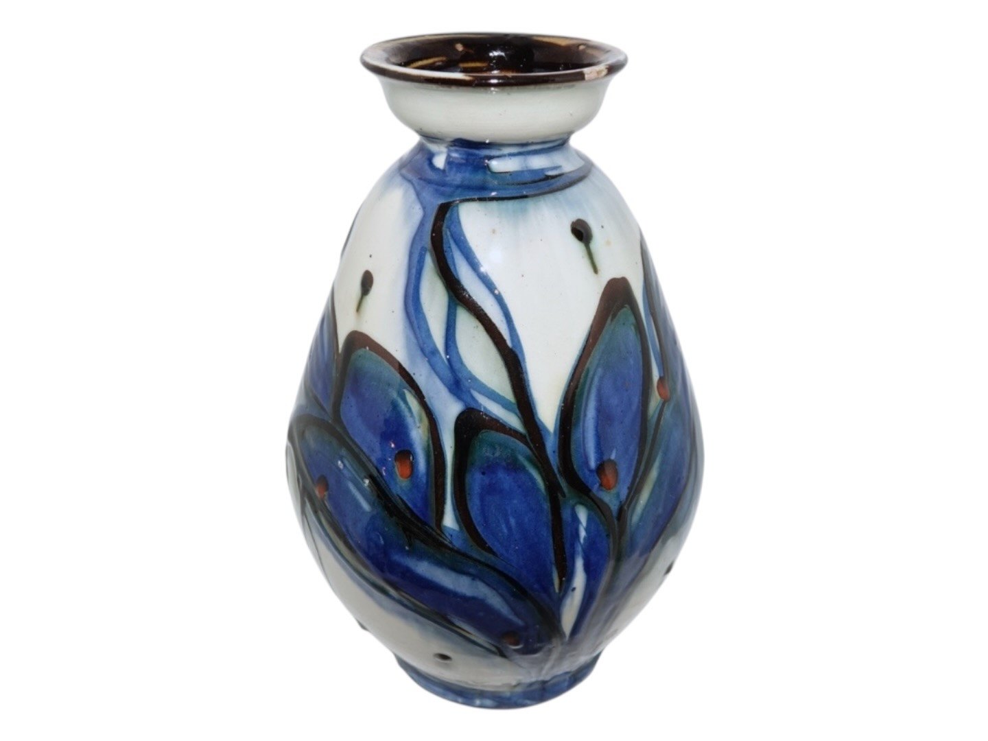 Kähler keramik, større vase med blå og hvid dekoration. Vasen er produceret i starten af 1900 tallet. Højde 25,0 cm. Der er nøk/små skår i både toppen og bunden af vasen, se fotos.