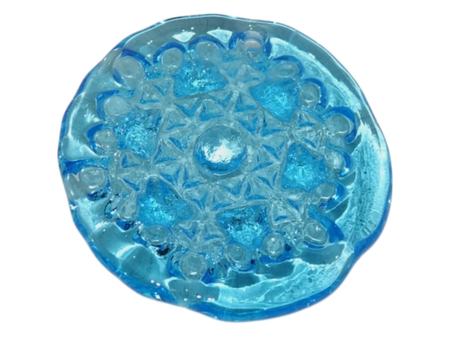 Glasværk fra Sverige, lille lyseblå solfanger fra 1970'erne eller 1980'erne. Diameter 6,8 cm. Perfekt stand. Internt varenummer: SOLFANGER22