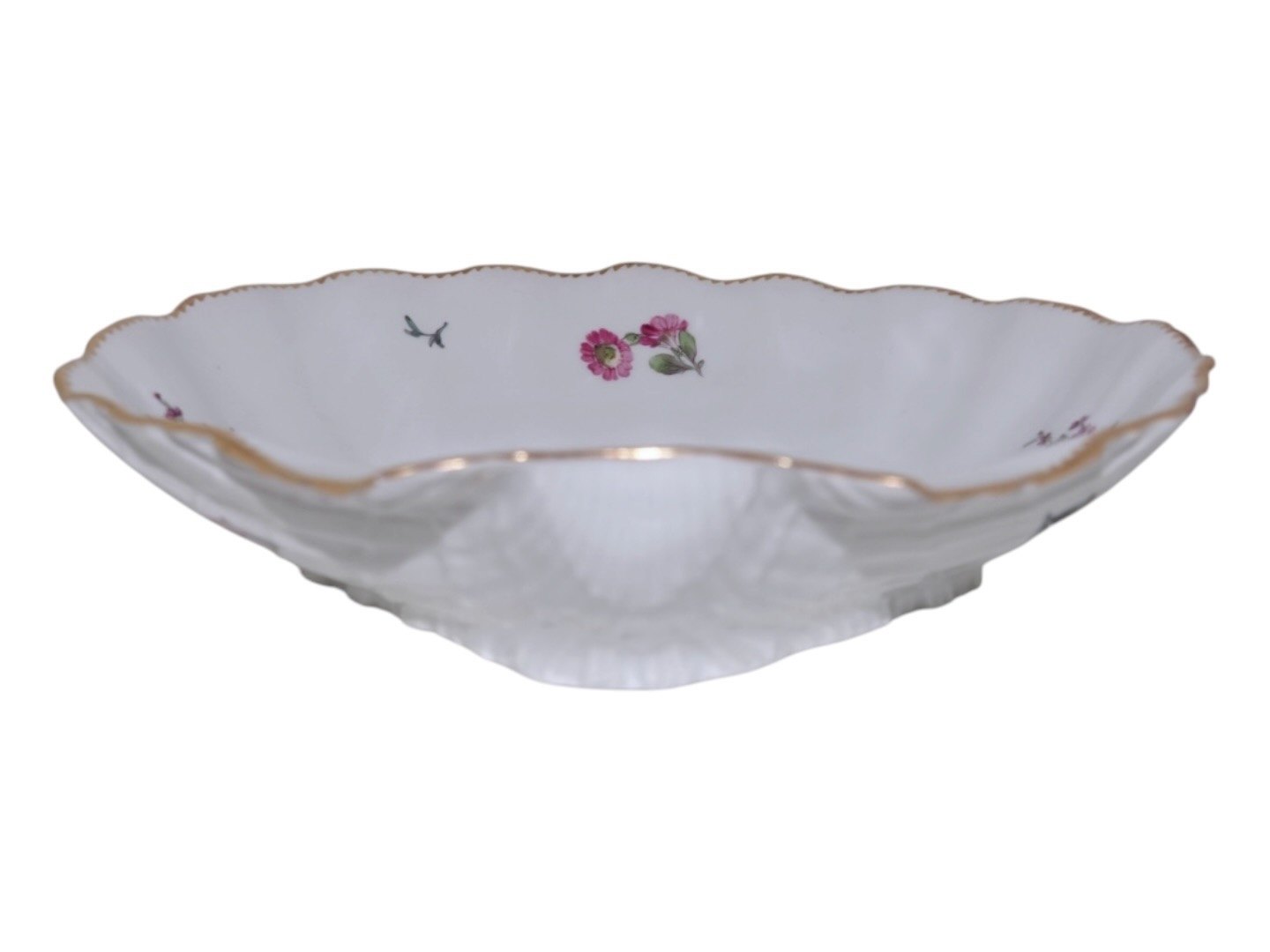 Royal Copenhagen Fuld Saksisk Blomst, sjælden set muslingformet skål. Dekorationsnummer 4/1605. Denne er produceret før 1928. 1. sortering. Den måler 21,0 x 19,3 cm. Perfekt stand uden fejl.