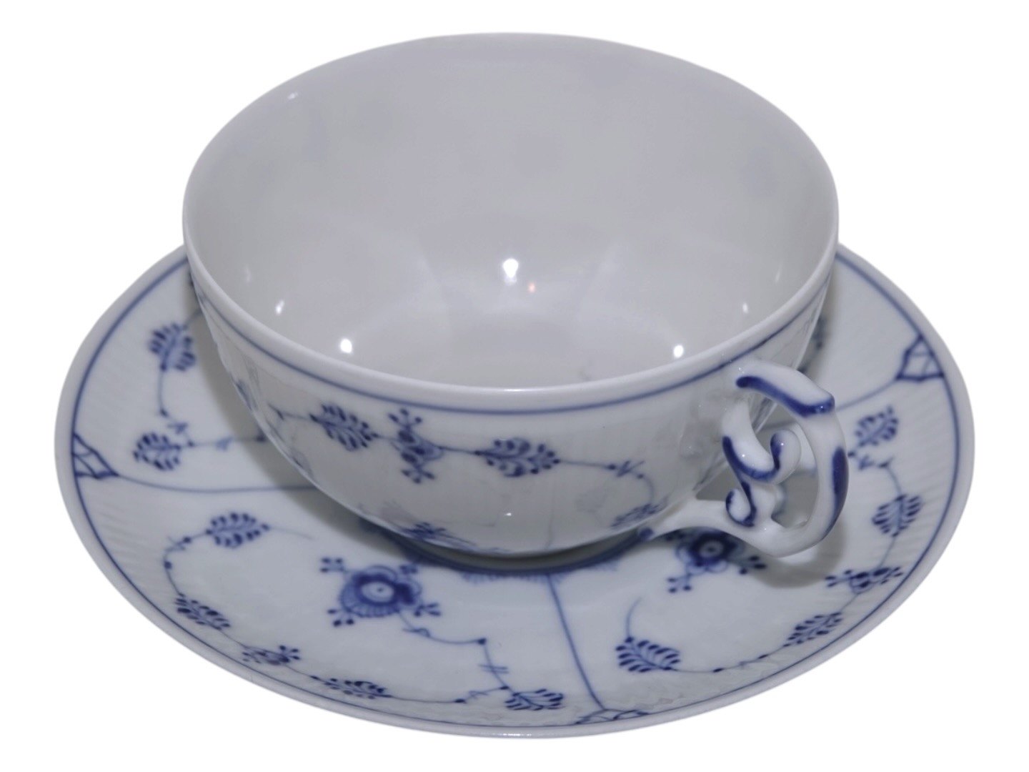 Royal Copenhagen Musselmalet Riflet, ekstra stor tekop også kaldet en kontorkop eller morgenkop. Dekorationsnummer 1/85. Kop er 1. sortering og underkop er 2. sortering. Koppen måler 10,9 cm. i diameter. Perfekt stand.