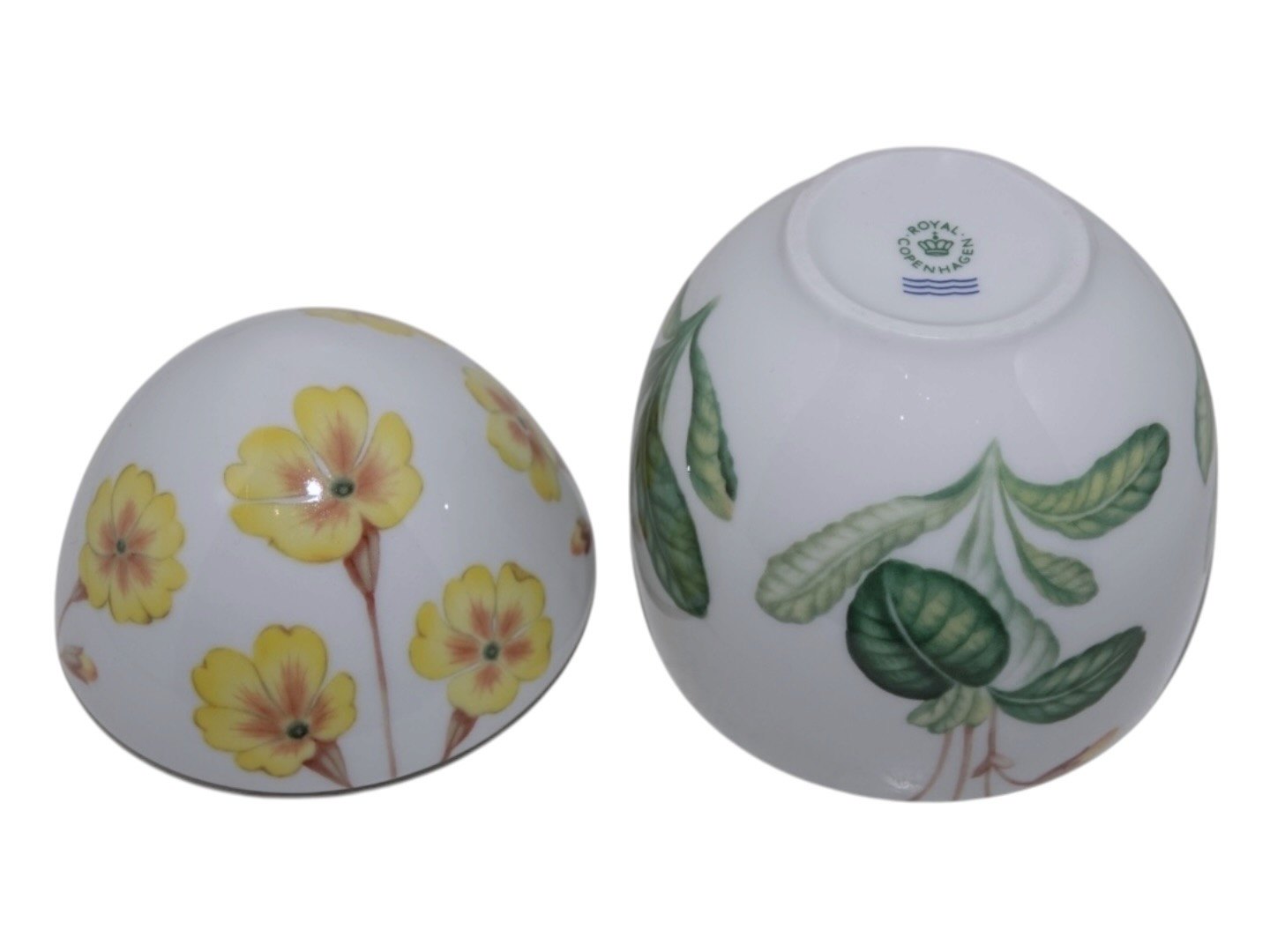 Royal Copenhagen påskeæg bonbonniere dekoreret med gul primula. 1. sortering. Højde 12,5 cm. Perfekt stand.