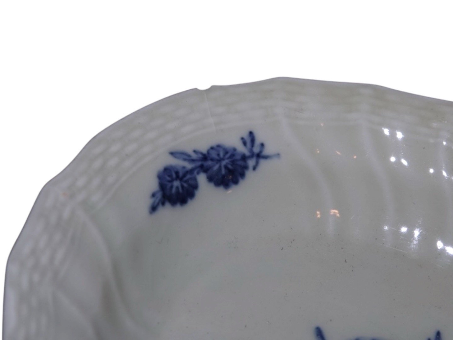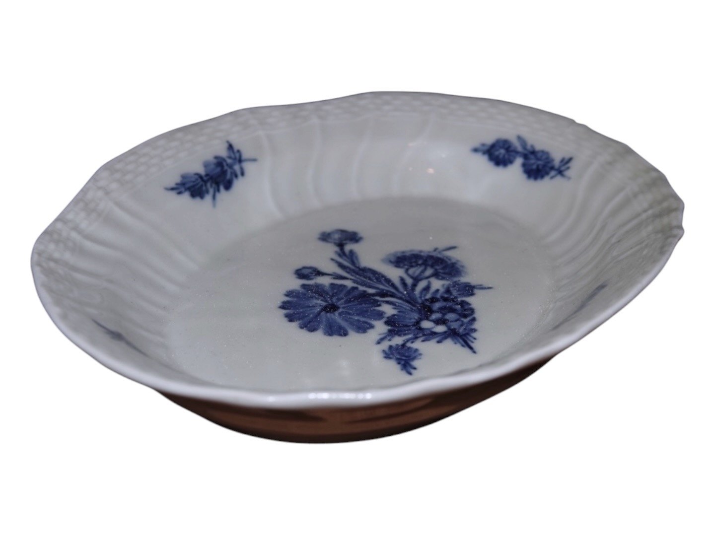 Royal Copenhagen Blå Blomst Svejfet, lille halvdyb asiet i gråligt porcelæn.
