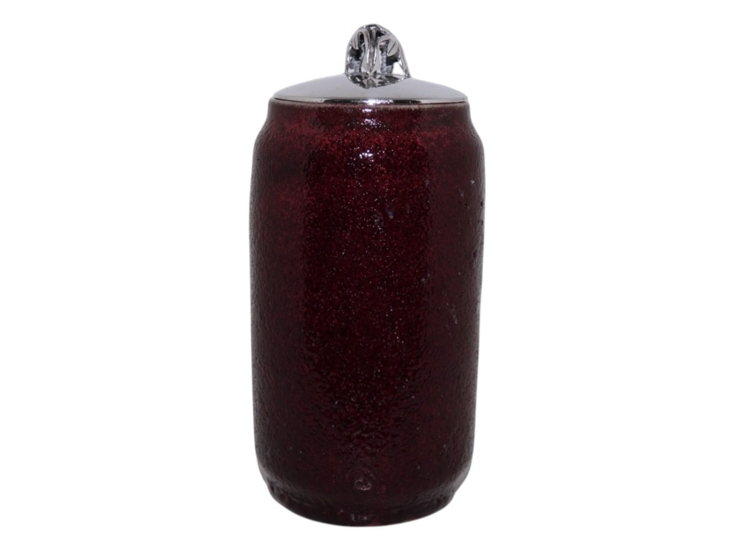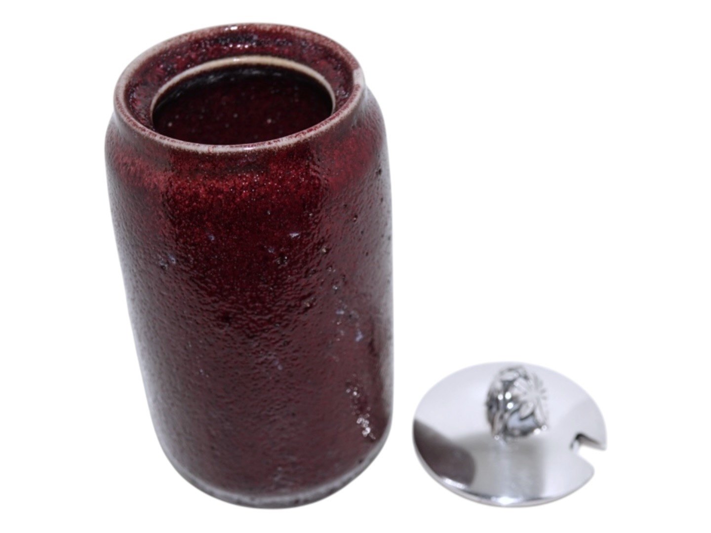 Royal Copenhagen keramik, vase med en flot okseblodsglasur. Oprindeligt har der været et andet låg men nu er der et tretårnet sølvlåg fra sølvsmed Peter Hertz. Låget er dateret 1942.