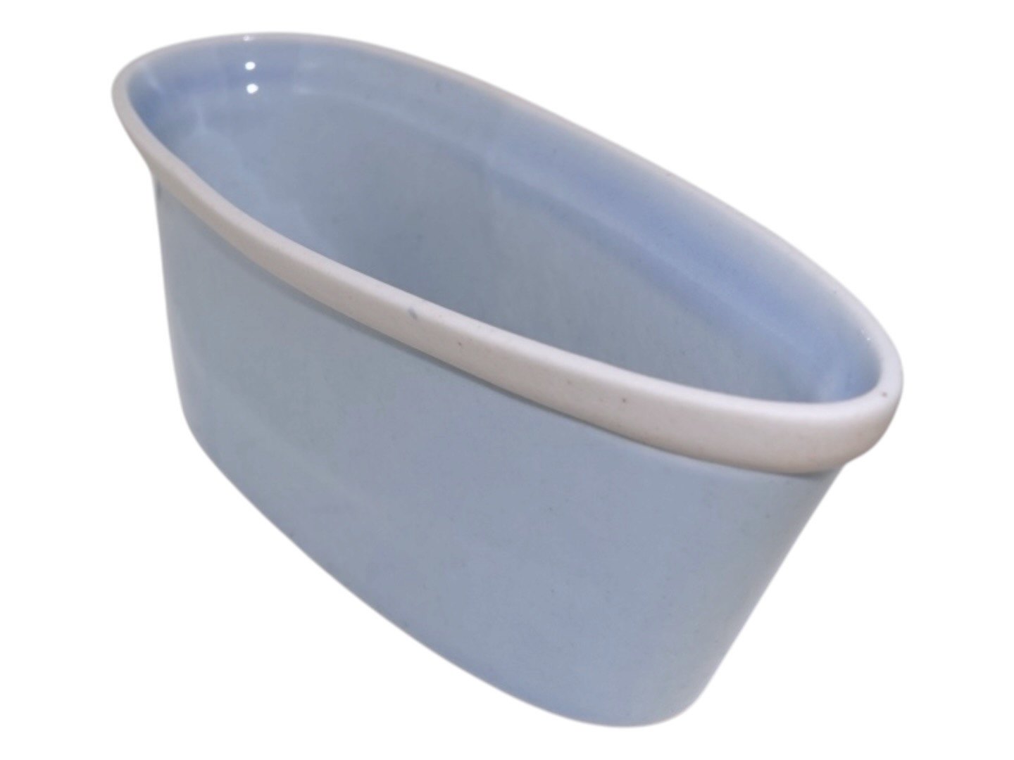 Bodil Manz keramik, bådformet lyseblå skål med hvid stribe. Fra eget værksted - fuldt signeret "BODIL MANZ" samt monogram. Længde 23,2 cm., højde 8,0 cm. Perfekt stand uden fejl.