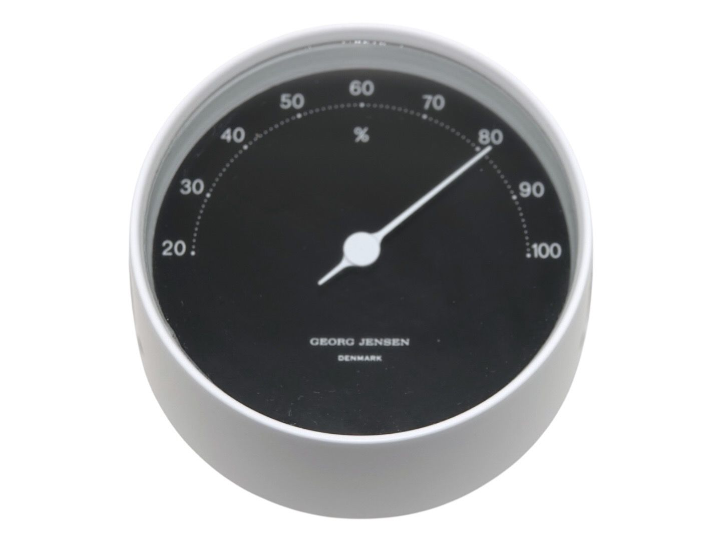 Georg Jensen Hygrometer in white case with black background. A hygrometer measures air humidity. Designed by Henning Koppel. Diameter 10.0 cm., depth 4.5 cm. Excellent condition.