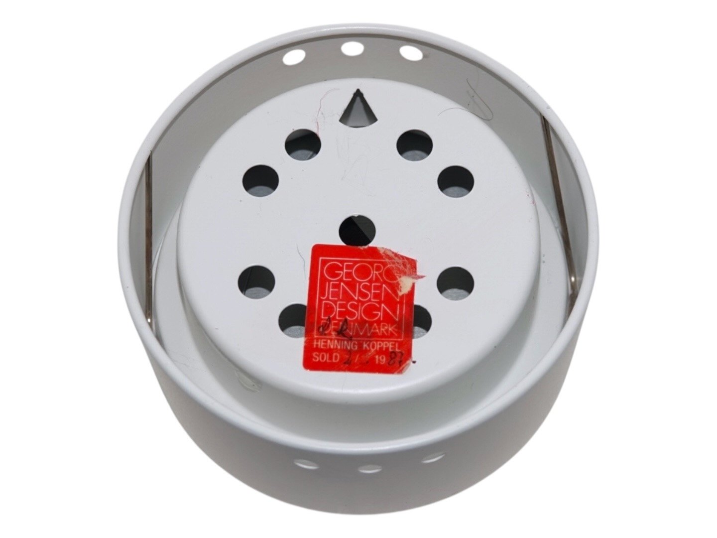 Georg Jensen Themometer in white case with black background.