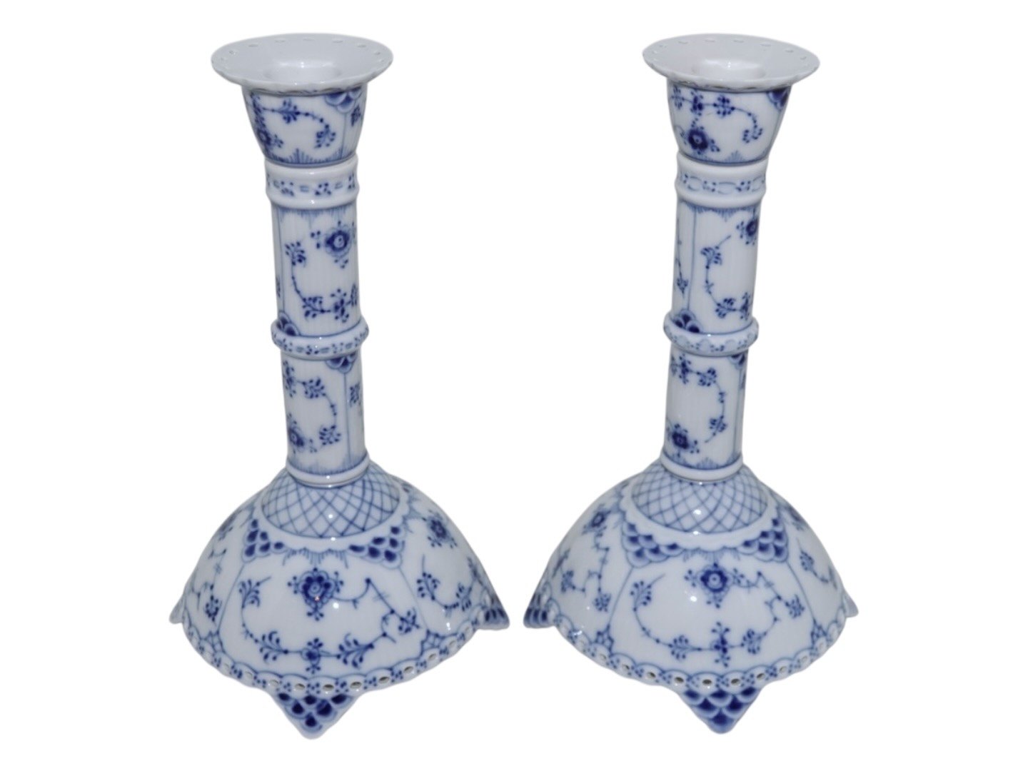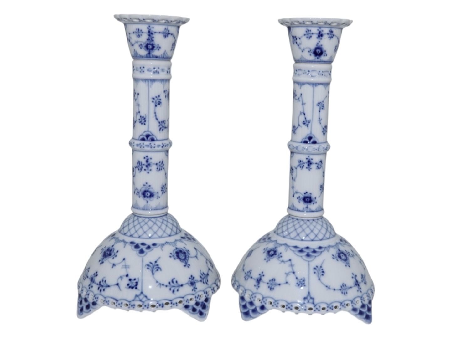 Royal Copenhagen Blue Fluted Full Lace, two tall candlelight holders.