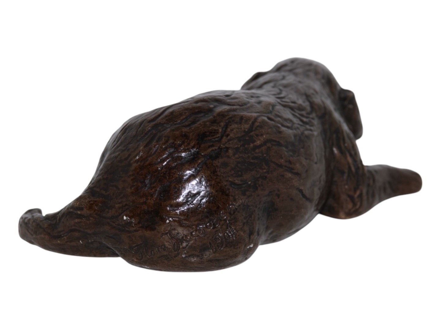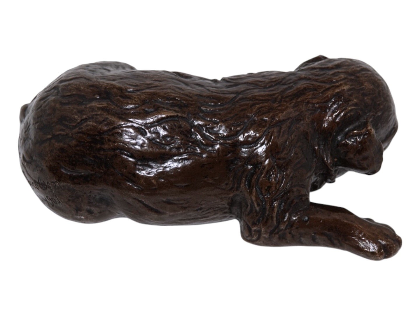Flora Jacobsen (1863-1959), bronze figurine of a puppy from 1901. It is probably a Golden Retriever or a Saint Bernard.