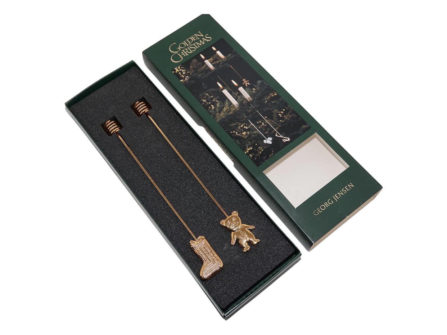 Georg Jensen Golden Christmas, pakke med to lysholdere med en julesok og bamse. Måler 15 cm. Fin stand.