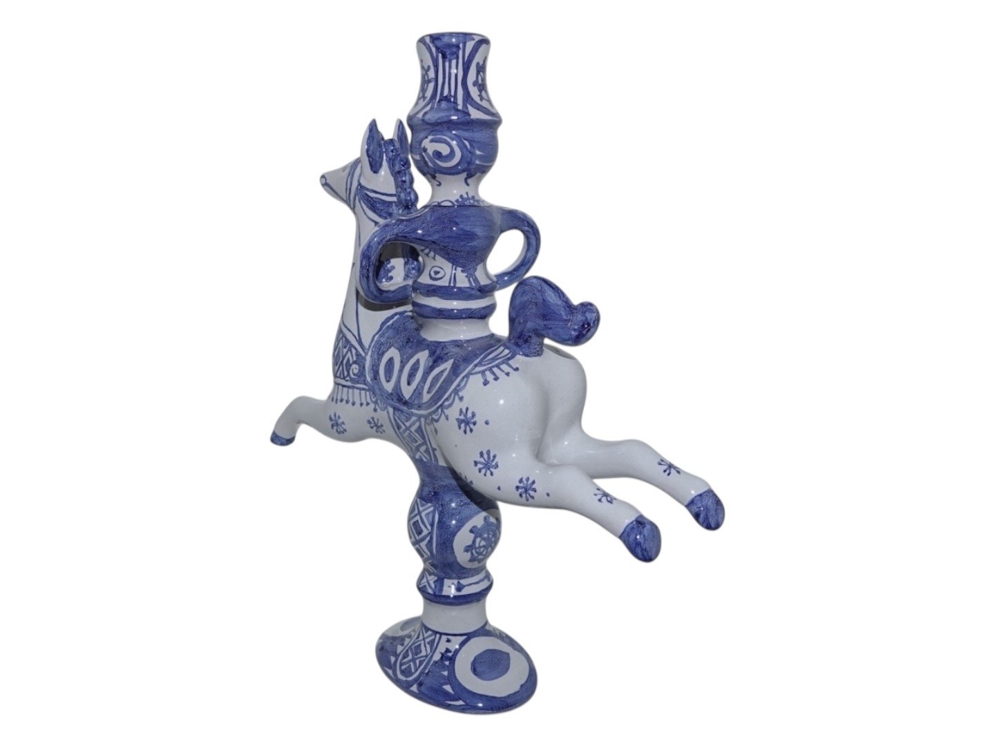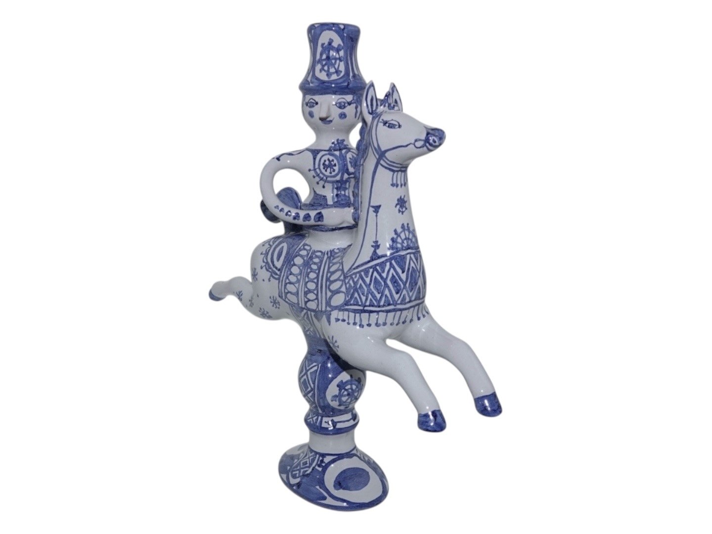 Bjørn Wiinblad figur rytter til hest - lysestage. Denne er produceret i 1979. Designnummer L4. Højde 31,8 cm., længde 27,6 cm. Perfekt stand.