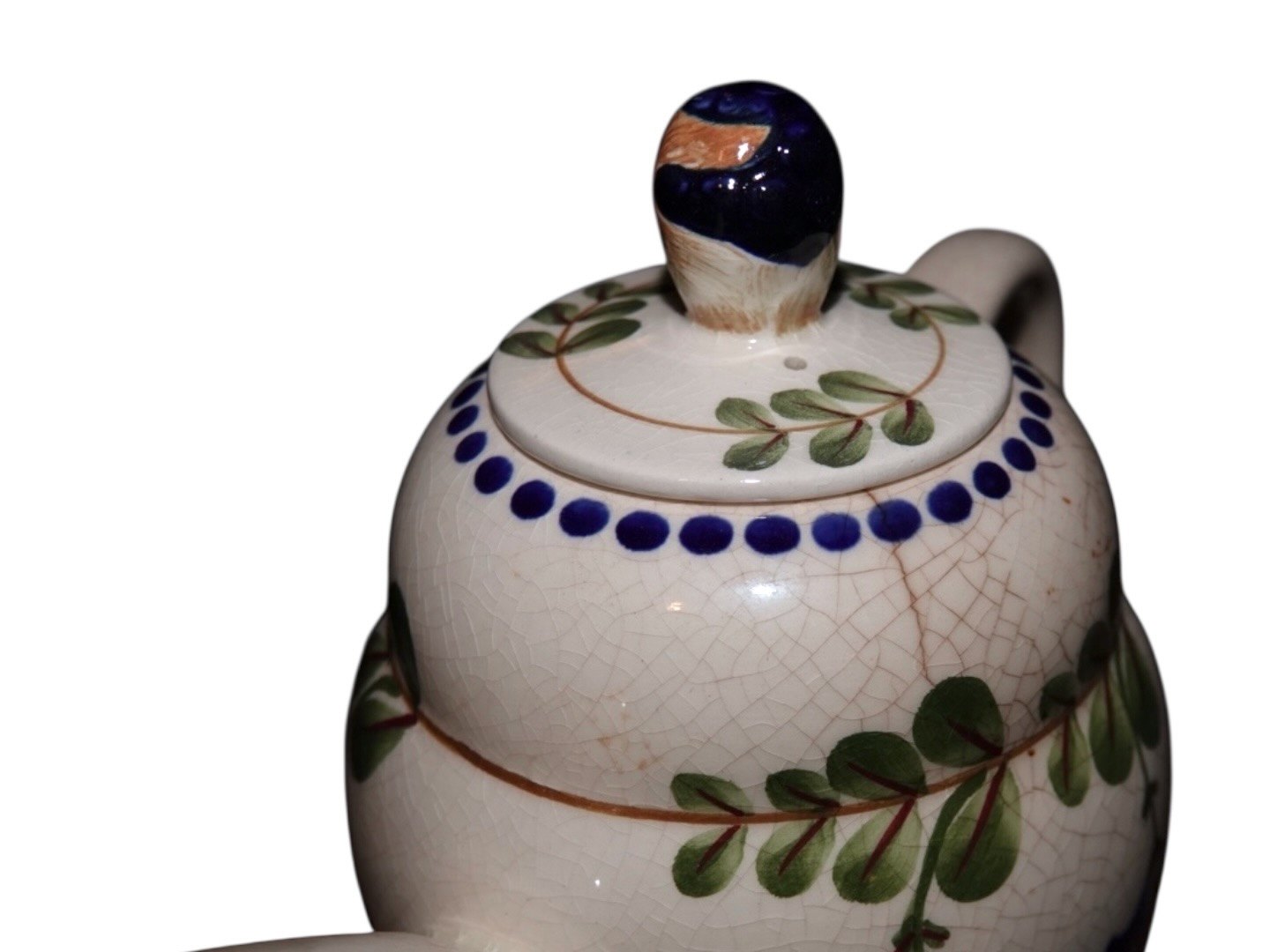 Der er en revne ved toppen se foto 3 samt krakkereringer og misfarvninger i glasuren.