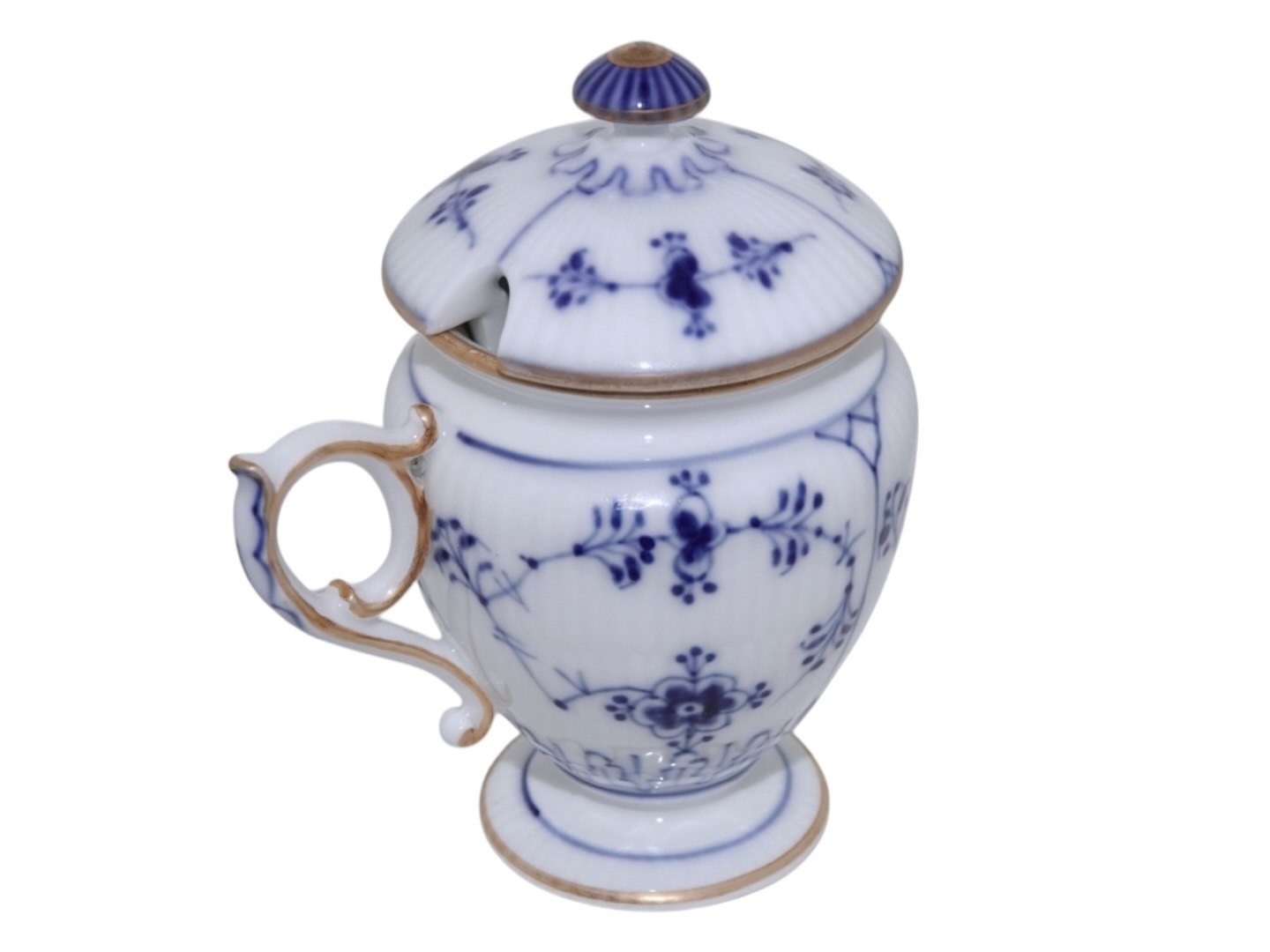 Royal Copenhagen Blue Fluted Plain with gold trim, rare lidded mustard jar.