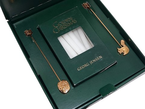 Georg Jensen Golden Christmas, To lysholdere med Kogle og Egern i gaveæske med små stearinlys. Måler 15 cm. Fin stand.
