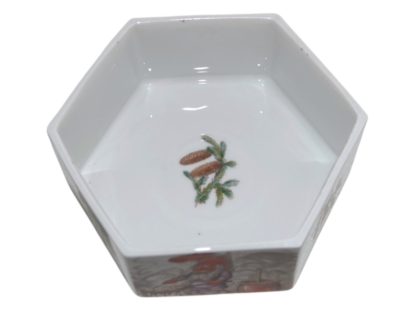 Bing & Grøndahl, sekskantet skål med låg dekoreret med nisser.