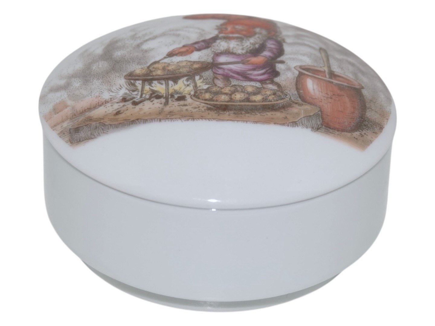 Bing & Grøndahl, rund bonbonniere med julenisse der bærer æbleskiver.