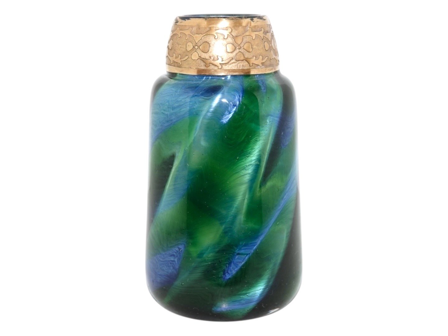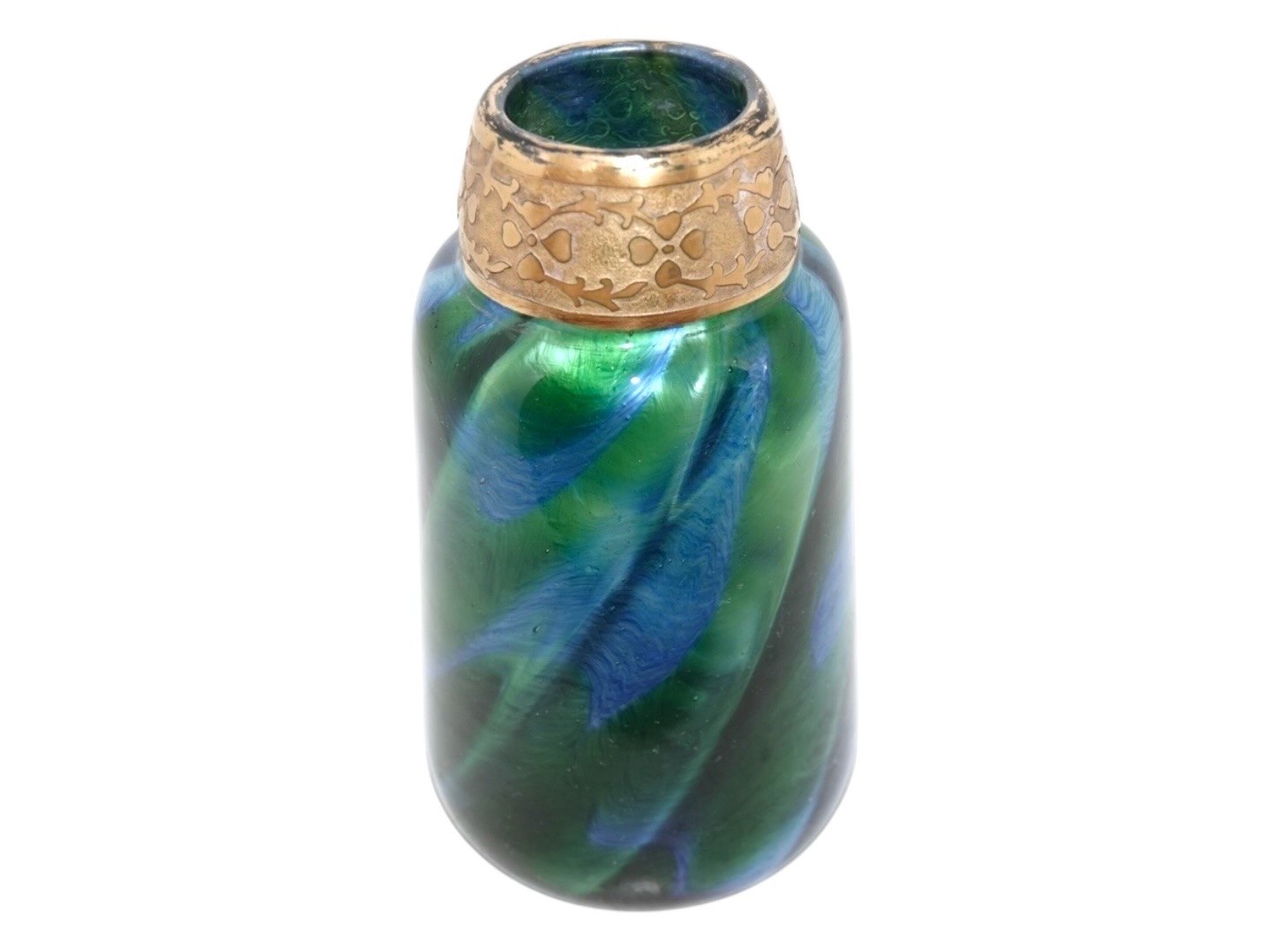 Bohemisk glas vase med grønne og blå farver fra omkring 1900 til 1920. Højde 12,4 cm. Der er lidt slid i guldet på toppen eller fin og fejlfri stand.