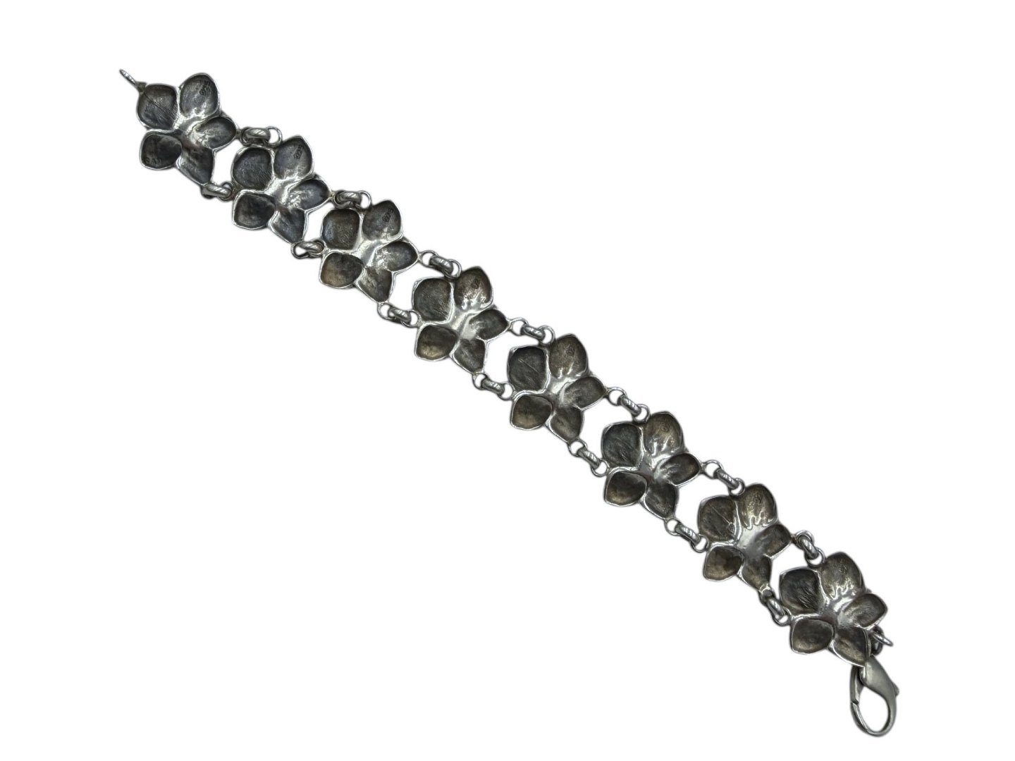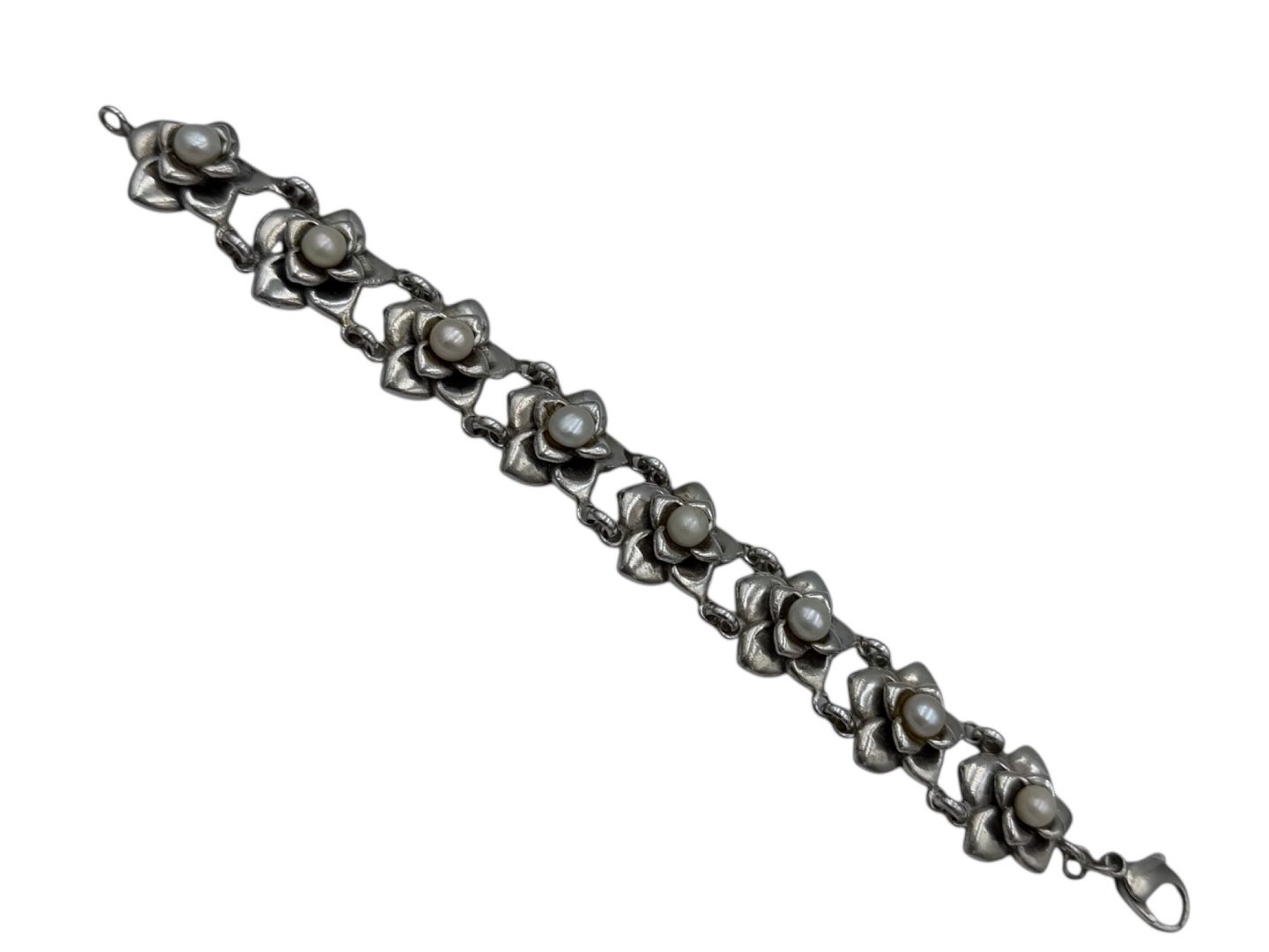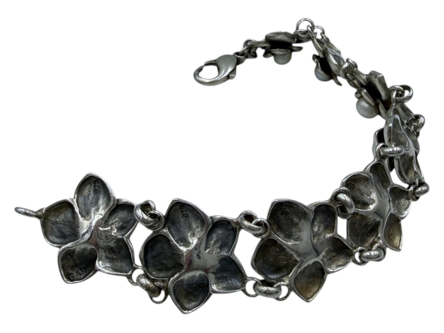 Tungt sterlingølv armbånd med blomster og perle lignende sten.