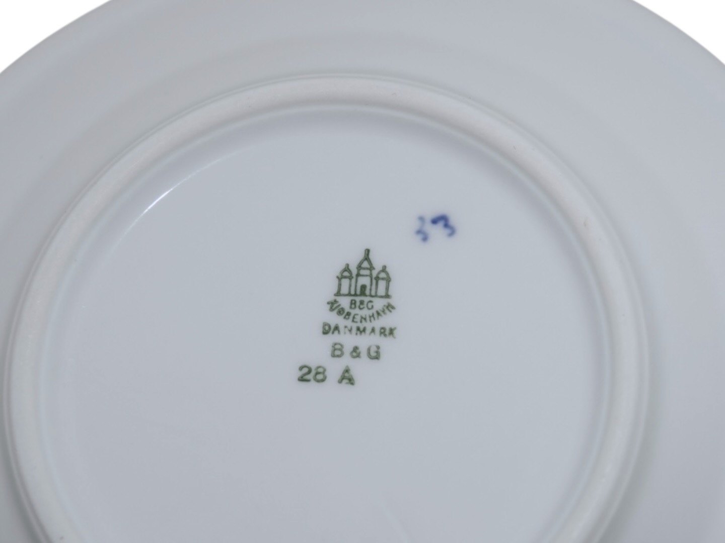 Bing & Grøndahl Blåmalet / Musselmalet tykt jernporcelæn, kagetallerken med logo fra Hotel Royal.