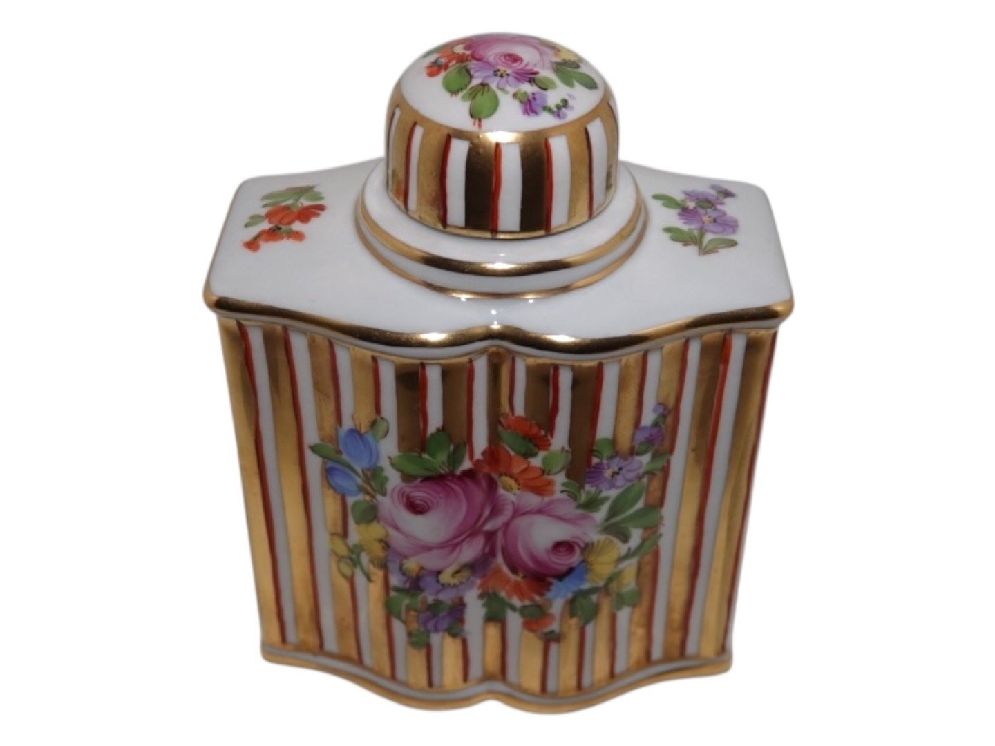 Dresden porcelæn, tedåse med Saksisk Blomst dekoration. Højde 13,0 cm., bredde 10,0 cm. Perfekt stand.
