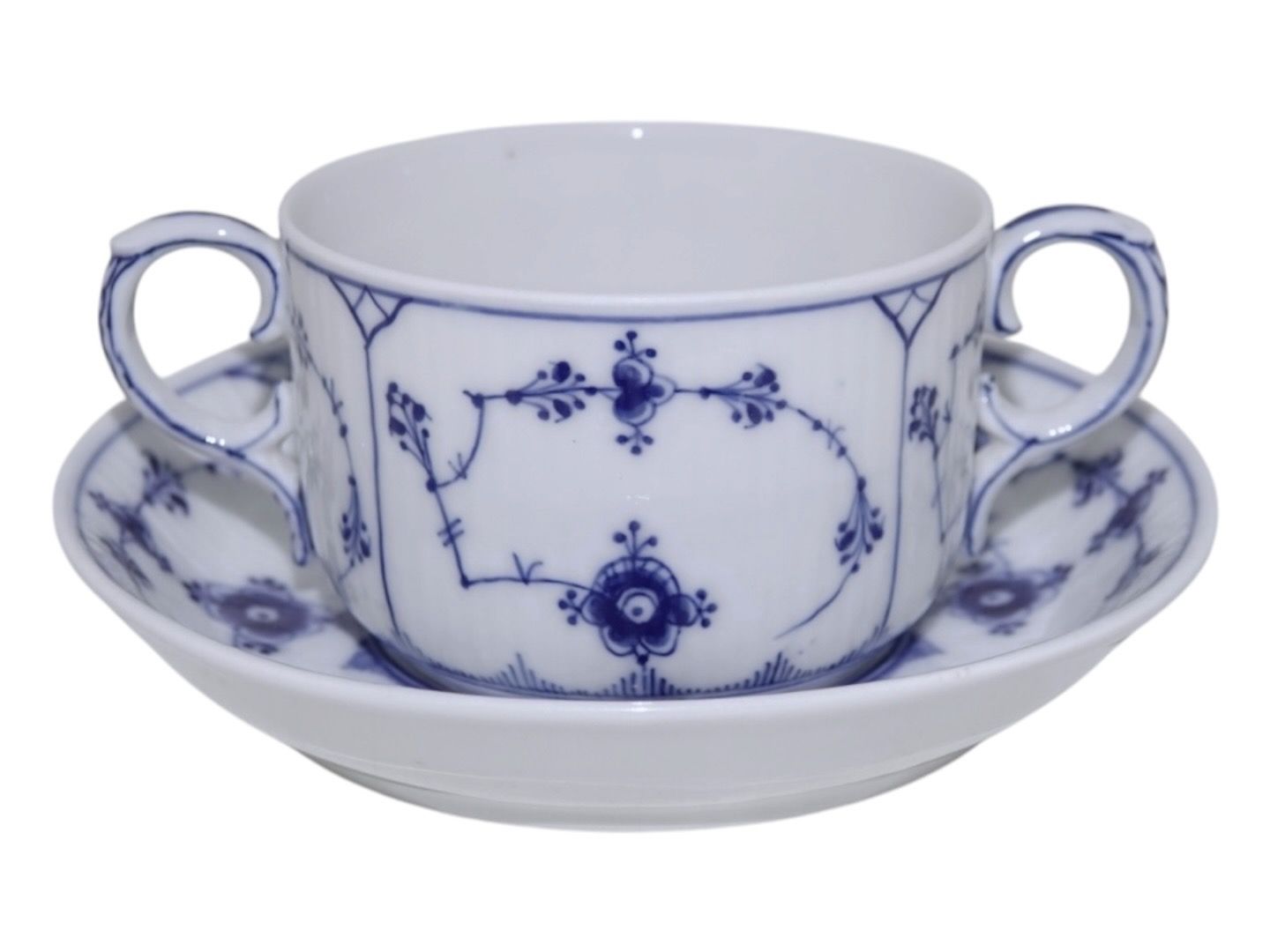 Royal Copenhagen Musselmalet Riflet, lille bouillionkop / ragoutkop uden låg men med tilhørende underkop.