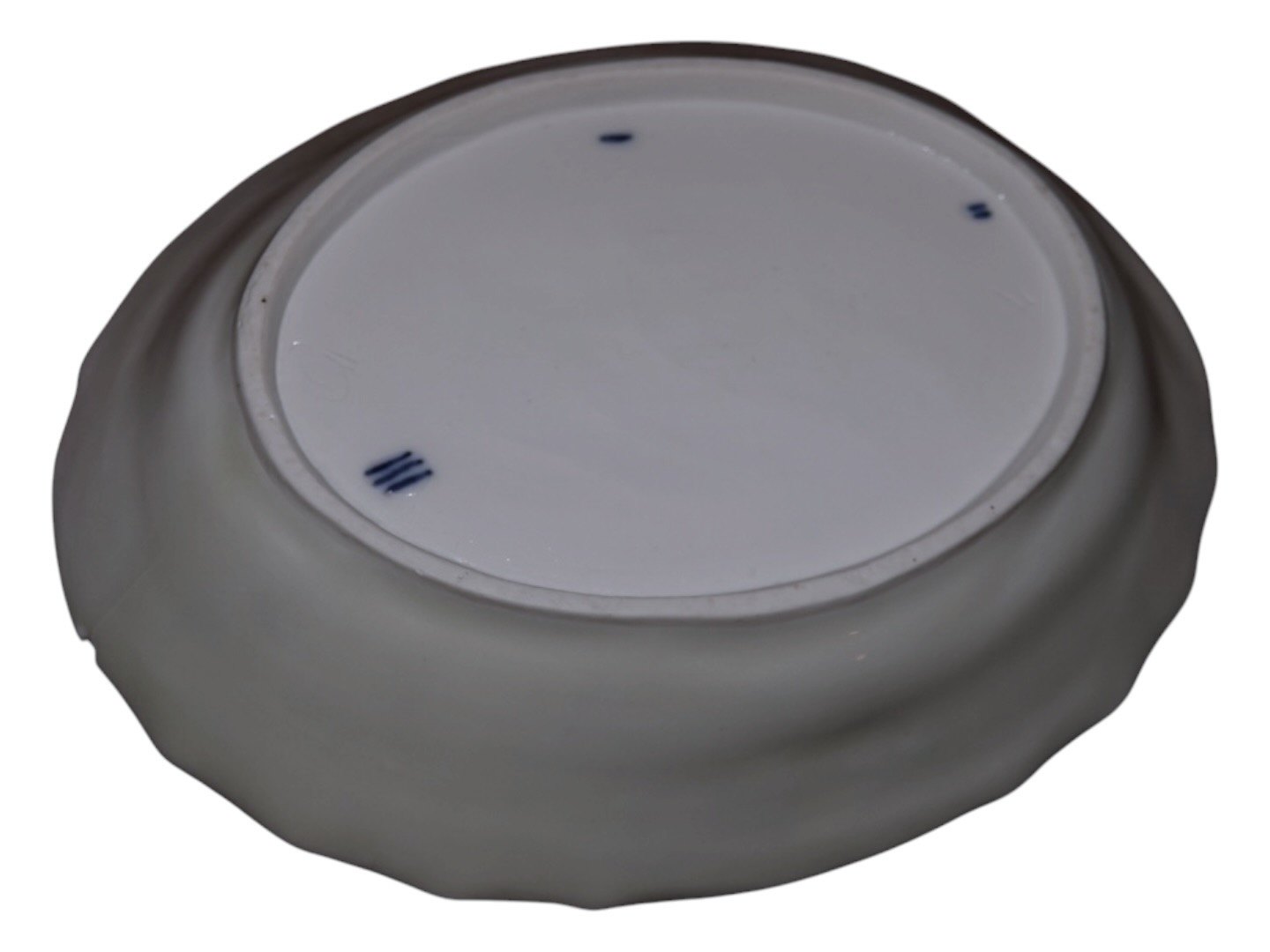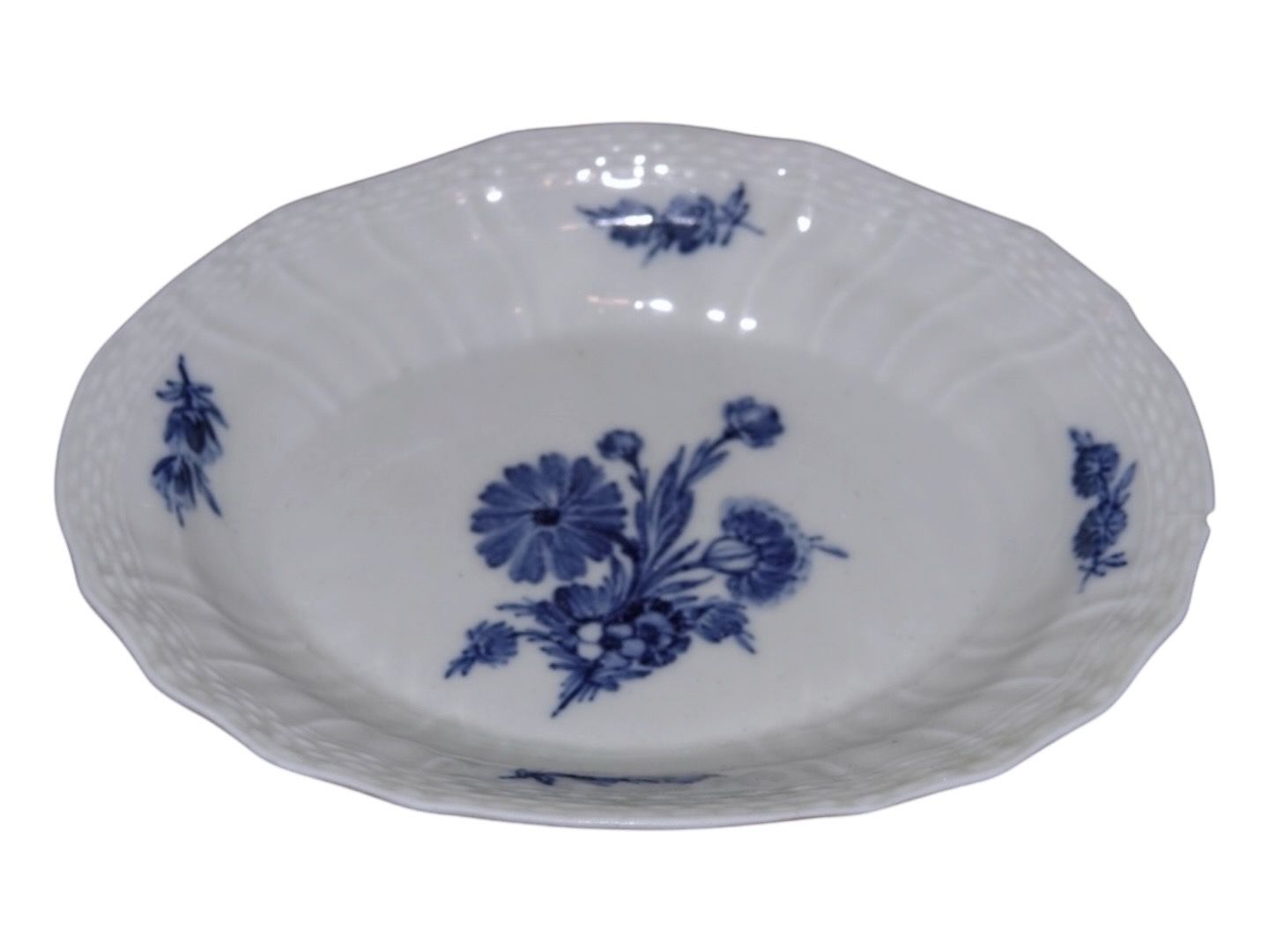 Royal Copenhagen Blå Blomst Svejfet, lille halvdyb asiet i gråligt porcelæn.