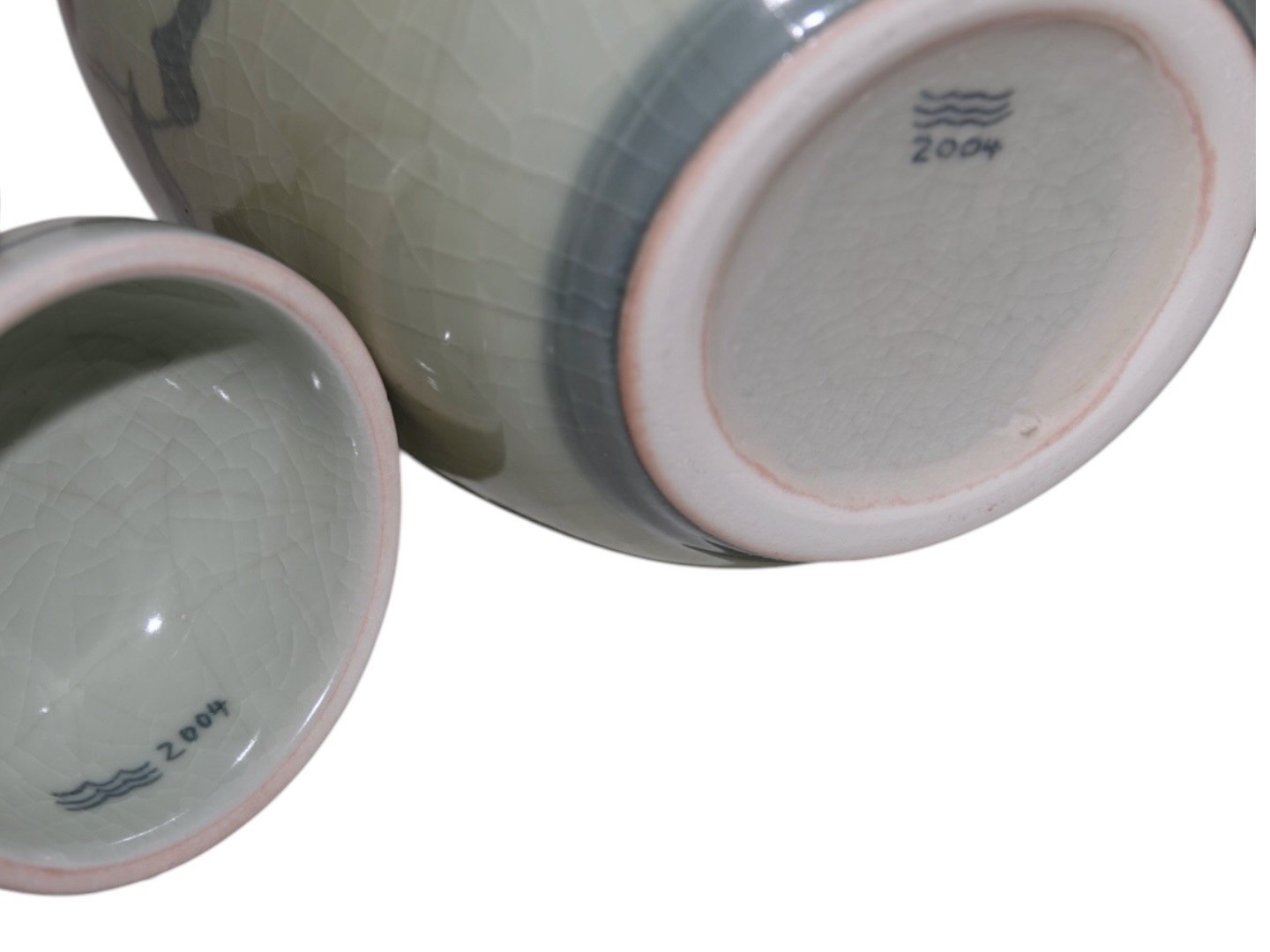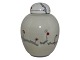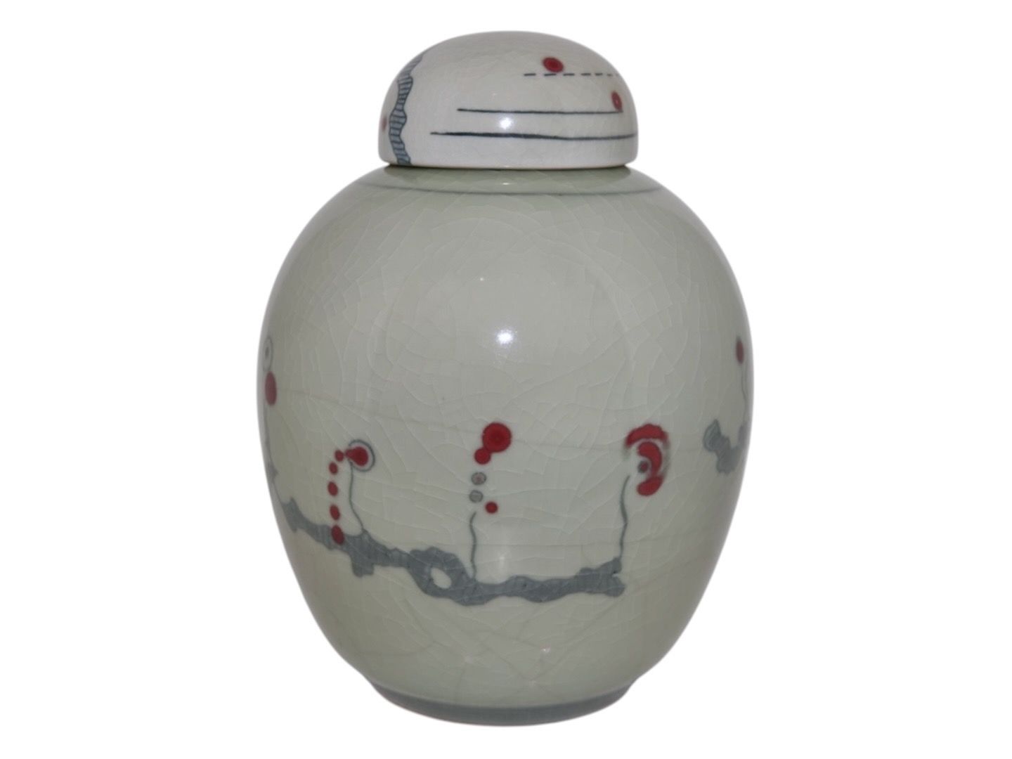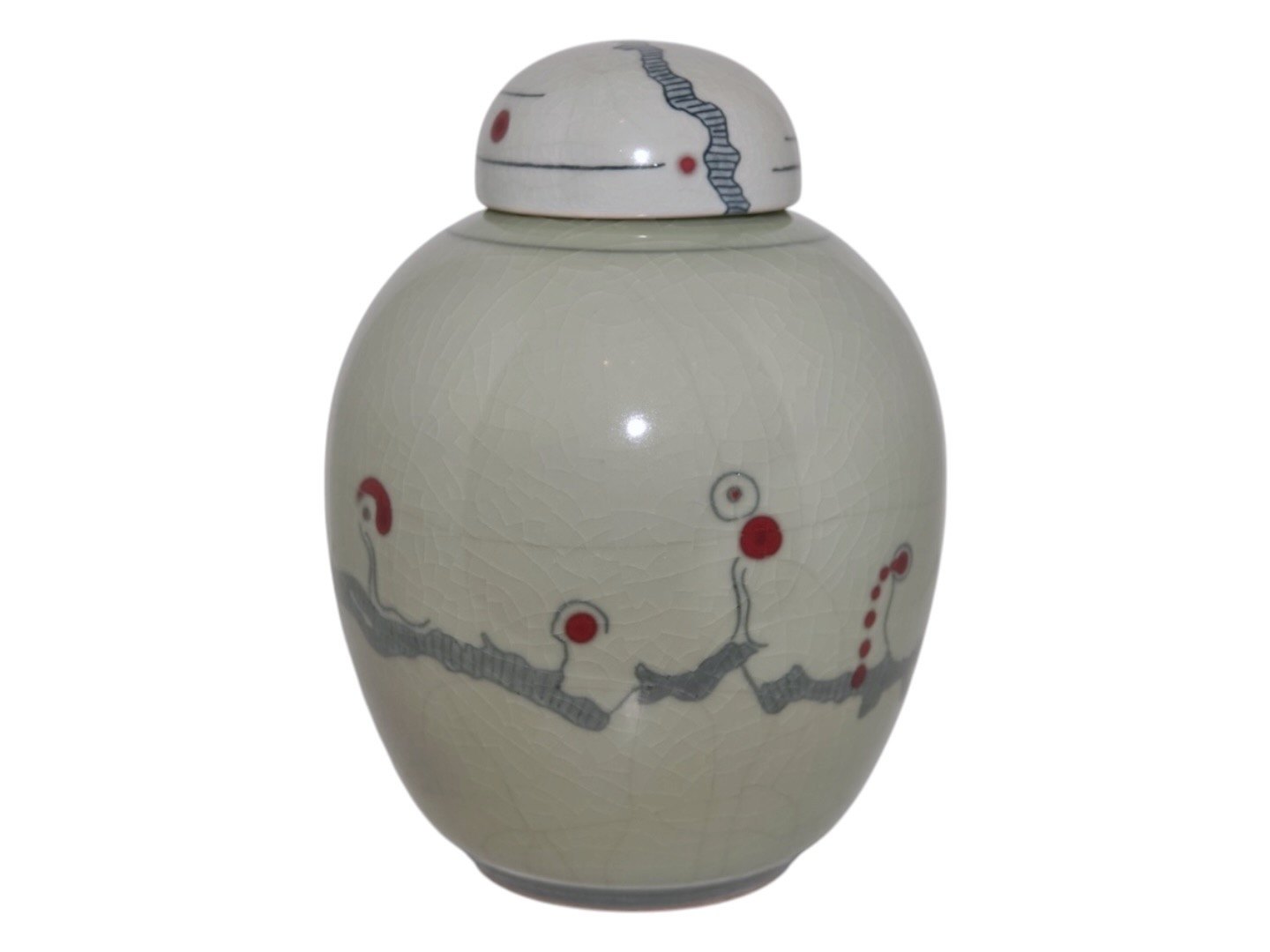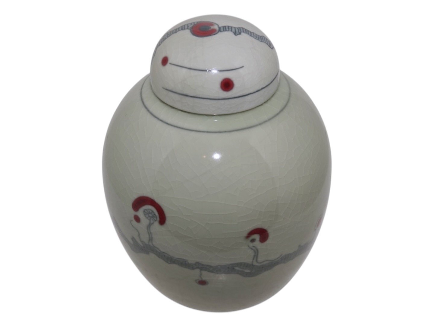 Royal Copenhagen krakkeleret kunstporcelæn, lysegrøn lågkrukke med rød surrealistisk kompensation. Den er udført i Vilhelm Bjerke Petersen stil.