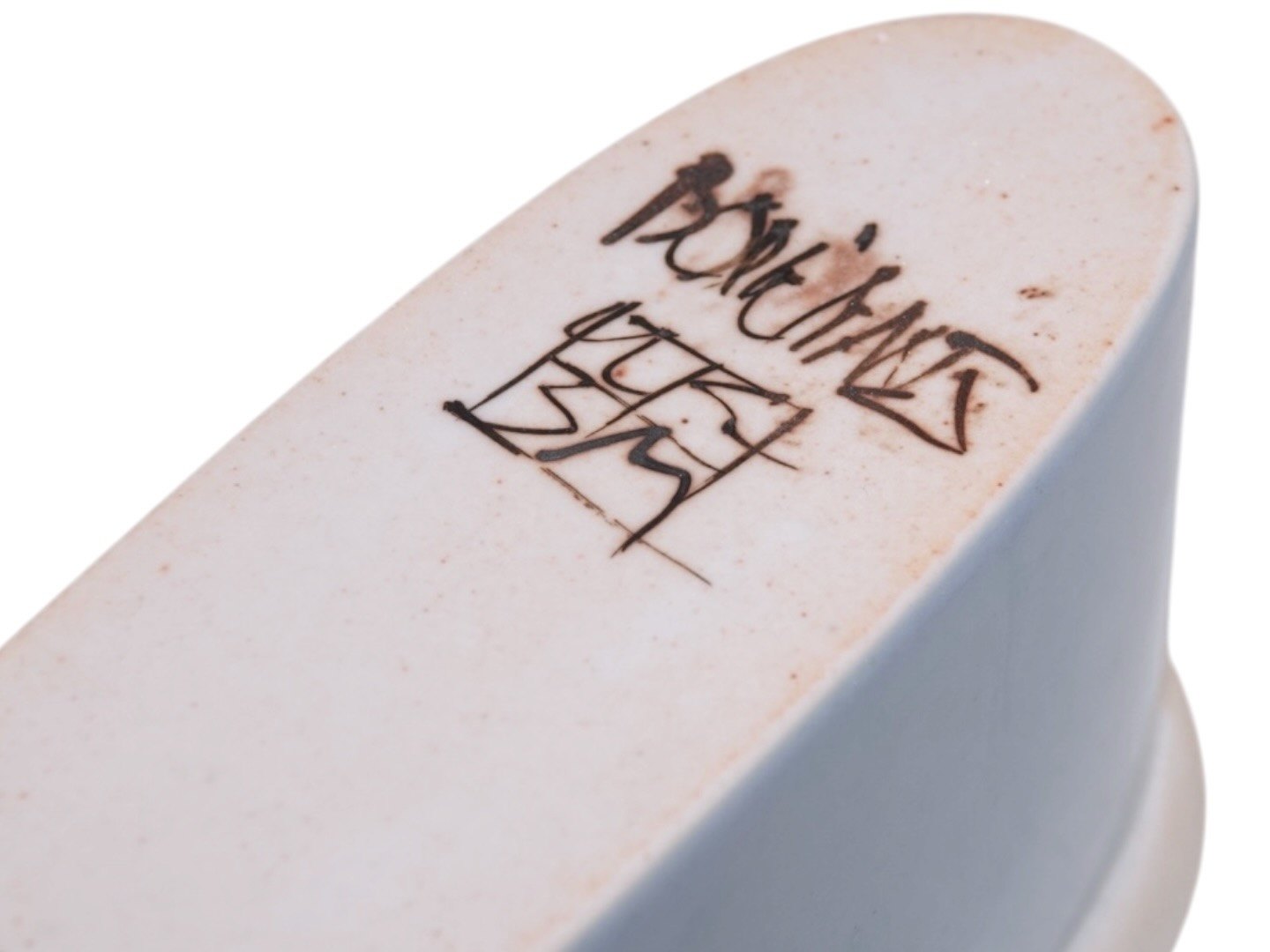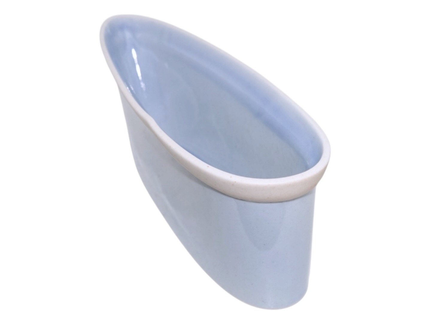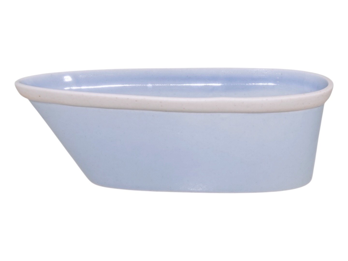 Bodil Manz keramik, bådformet lyseblå skål med hvid stribe. Fra eget værksted - fuldt signeret "BODIL MANZ" samt monogram. Længde 23,2 cm., højde 8,0 cm. Perfekt stand uden fejl.