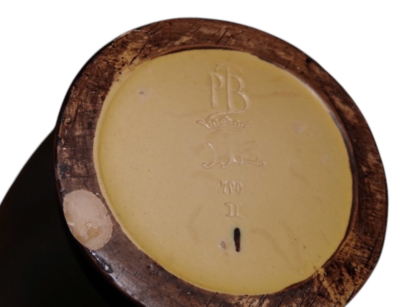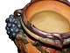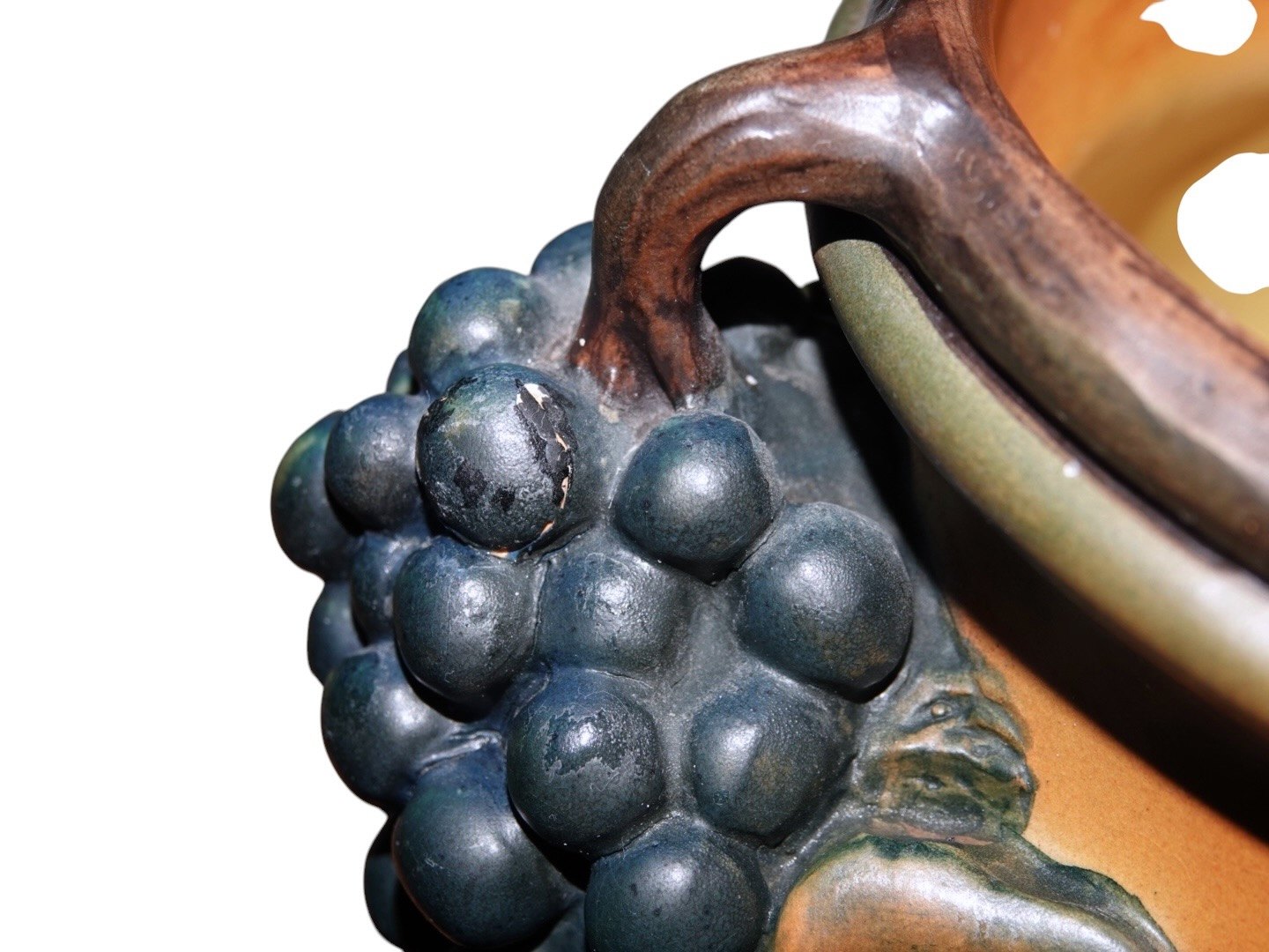 Der er to skår på bundkanten, en lille afskalning i toppen samt en reperation på en drueklase, se fotos.